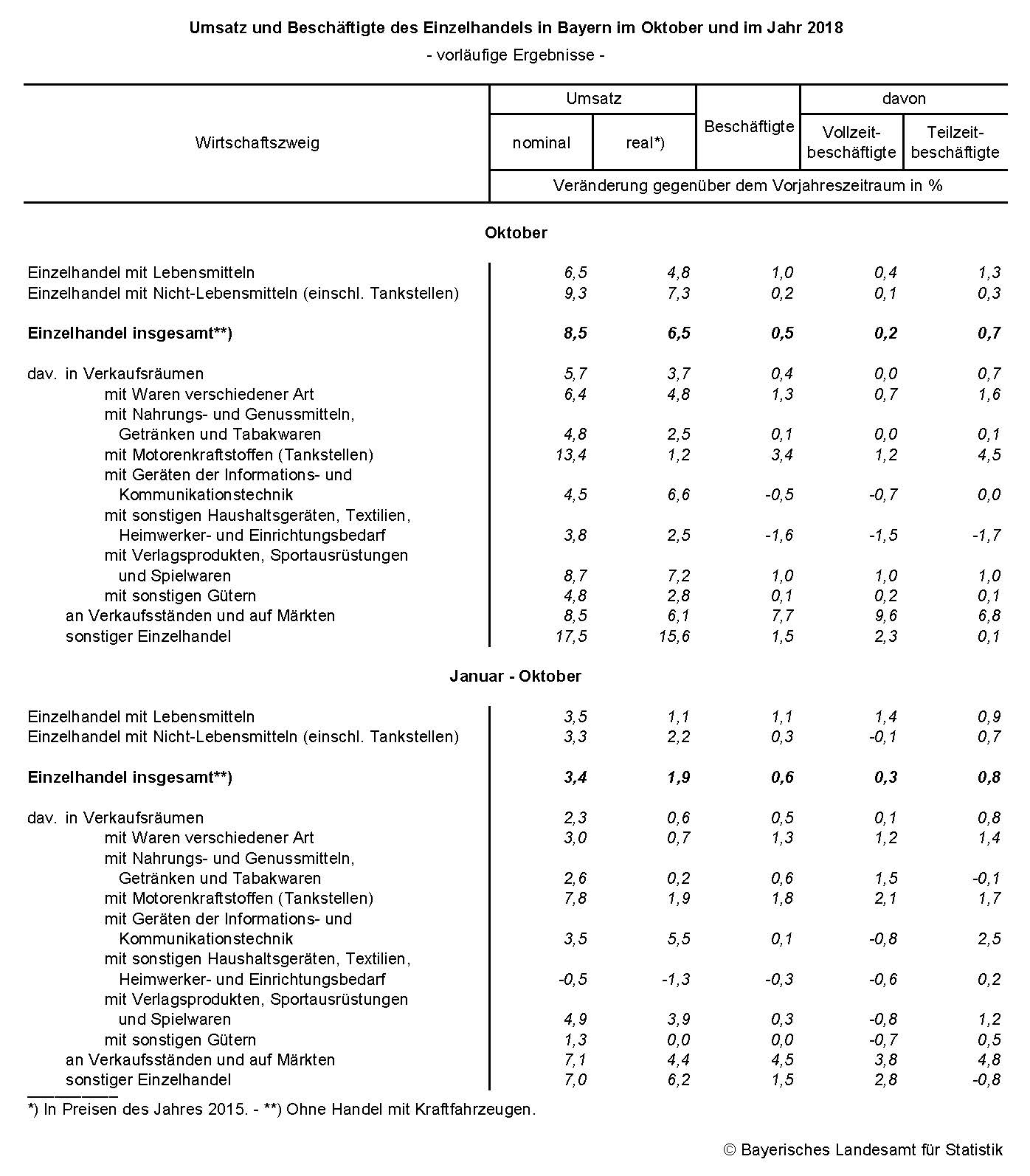 Nach den ersten, im Bayerischen Landesamt für Statistik vorliegenden Ergebnissen zur Monatsstatistik im Einzelhandel stieg der Umsatz im bayerischen Einzelhandel im Oktober 2018 gegenüber dem Vorjahresmonat nominal um 8,5 Prozent und real um 6,5 Prozent. Die Zahl der Beschäftigten wuchs um 0,5 Prozent. – In den ersten zehn Monaten 2018 nahm der nominale Umsatz des Einzelhandels im Vergleich zum Vorjahreszeitraum um 3,4 Prozent und der reale Umsatz um 1,9 Prozent zu.
