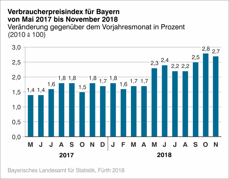Nach Angaben des Bayerischen Landesamts für Statistik lag die Inflationsrate, das ist die Veränderung des Verbraucherpreisindex für Bayern gegenüber dem entsprechenden Vorjahresmonat in Prozent, im November 2018 bei +2,7 Prozent; im vorangegangenen Oktober hatte sie bei +2,8 Prozent gelegen. Ohne Heizöl und Kraftstoffe gerechnet, läge die Inflationsrate bei +1,7 Prozent.