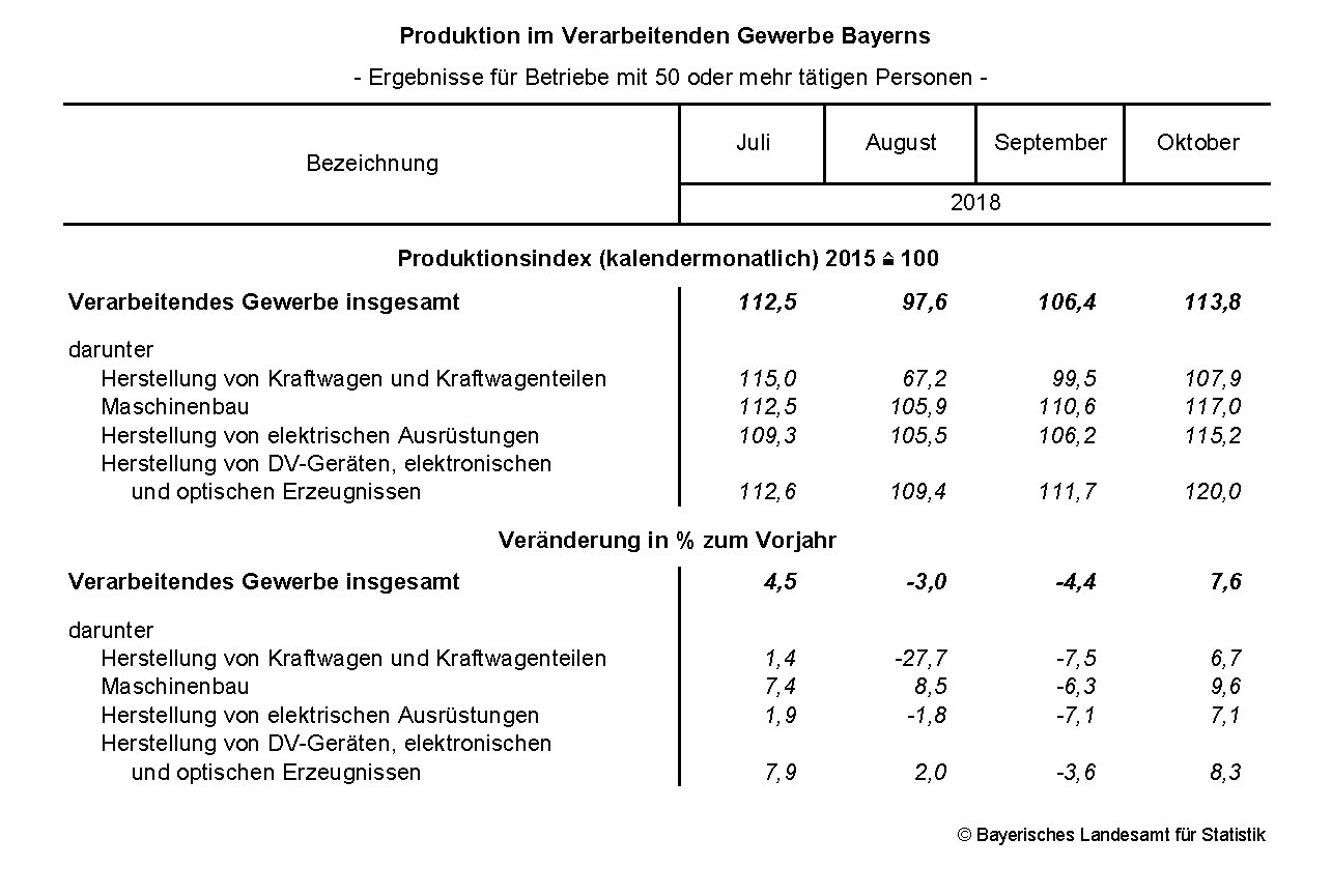 Nach Angaben des Bayerischen Landesamts für Statistik konnte die Produktion des Verarbeitenden Gewerbes im Oktober 2018 eine Zunahme von 7,6 Prozent gegenüber dem Vorjahresergebnis verzeichnen. Die ersten zehn Monate des Jahres 2018 erbrachten ein Plus von 3,0 Prozent.