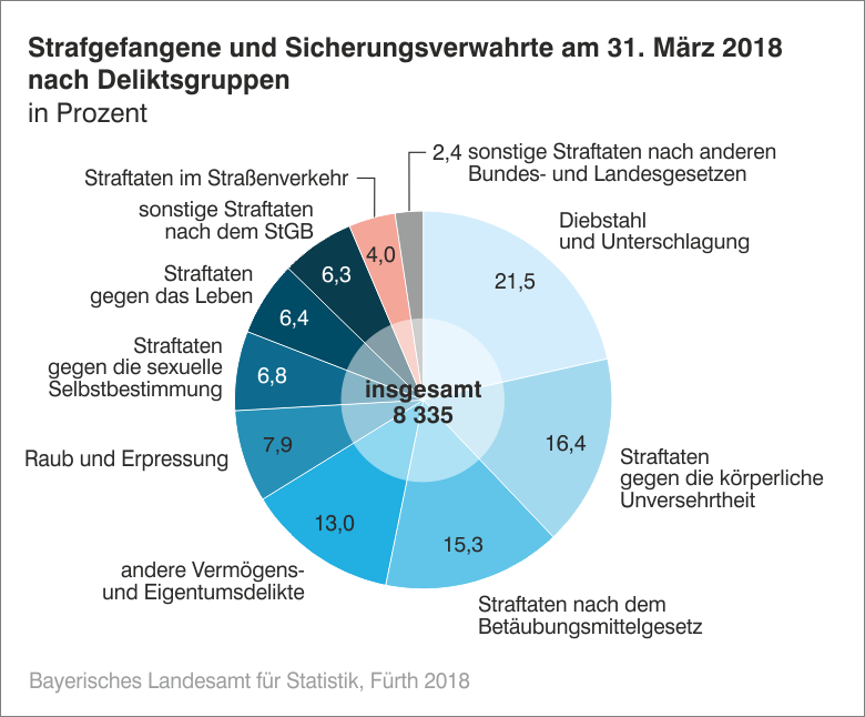 Ende März 2018 waren in den 36 bayerischen Justizvollzugsanstalten 8 335 Strafgefangene und Sicherungsverwahrte inhaftiert, das sind 0,2 Prozent weniger als im Vorjahr. Nach Angaben des Bayerischen Landesamts für Statistik waren 95,2 Prozent der einsitzenden Personen Erwachsene (über 21 Jahre), 7,2 Prozent weiblich, 62,3 Prozent hatten eine deutsche Staatsbürgerschaft und 72,8 Prozent waren vorbestraft. 47,4 Prozent der Strafgefangenen verbüßten eine Freiheitsstrafe von bis zu einem Jahr. Diebstahl und Unterschlagung lagen in 21,5 Prozent der Fälle der Haft zugrunde.