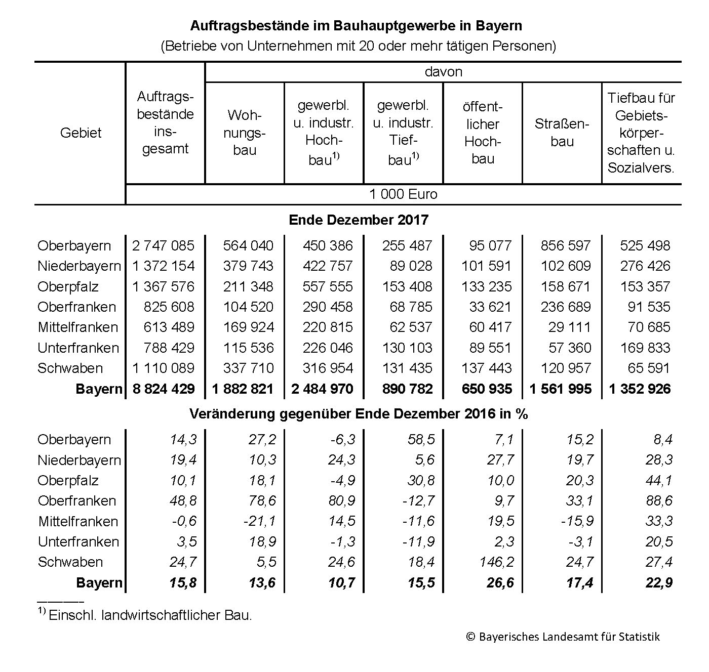 Das bayerische Bauhauptgewerbe verzeichnete Ende Dezember 2017 Auftragsbestände im Gesamtwert von 8,82 Milliarden Euro. Nach Angaben des Bayerischen Landesamts für Statistik bedeutet dies eine Steigerung des sektoralen Auftragsvolumens um 15,8 Prozent gegenüber dem vergleichbaren Vorjahresergebnis. Zu diesem positiven Gesamtergebnis haben alle Bausparten beigetragen, darunter weit überdurchschnittlich die Bausparten öffentlicher Hochbau sowie Tiefbau für Gebietskörperschaften und Sozialversicherungen, die gegenüber Ende Dezember 2016 eine Zuwachsrate von 26,6 Prozent bzw. 22,9 Prozent verzeichneten. Den vergleichsweise schwächsten Anstieg konnte der gewerbliche und industrielle Hochbau nachweisen (+10,7 Prozent). Das aktuelle Ergebnis in regionaler Untergliederung auf Ebene der Regierungsbezirke betrachtet, war mit Ausnahme von Mittelfranken (-0,6 Prozent) für alle Regierungsbezirke Bayerns ein Plus zwischen 3,5 Prozent (Unterfranken) und 48,8 Prozent (Oberfranken) festzustellen.