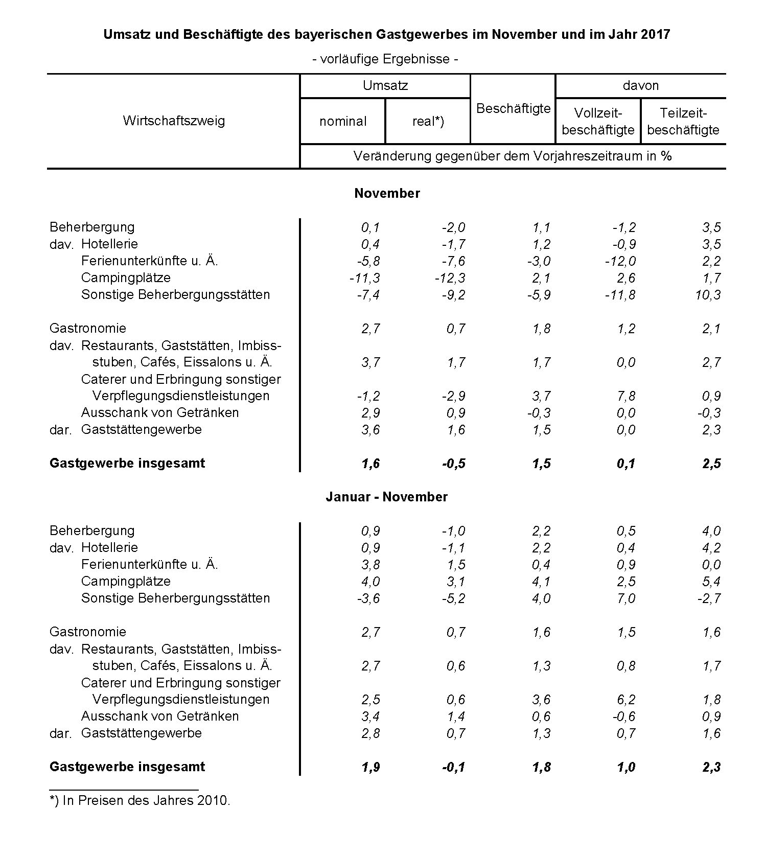 Nach einer Mitteilung des Bayerischen Landesamts für Statistik wuchs der nominale Umsatz im bayerischen Gastgewerbe im November 2017 im Vergleich zum Vorjahresmonat nach vorläufigen Ergebnissen um 1,6 Prozent, der reale Umsatz verringerte sich allerdings um 0,5 Prozent. Die Zahl der Beschäftigten nahm im November 2017 um 1,5 Prozent zu (Vollzeitbeschäftigte: +0,1 Prozent; Teilzeitbeschäftigte: +2,5 Prozent).