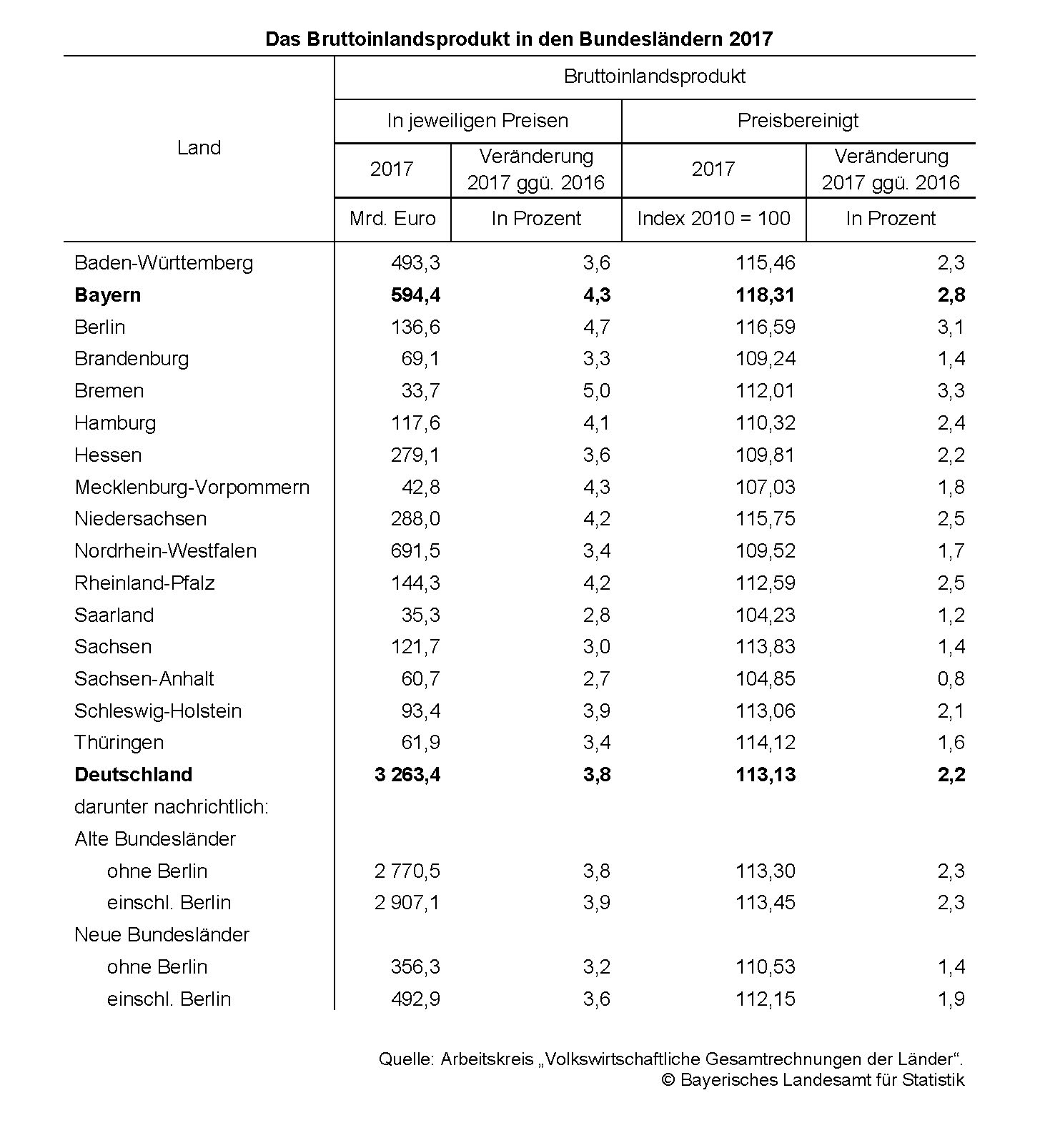 Das Bruttoinlandsprodukt (BIP) erhöhte sich im Jahr 2017 nach Mitteilung des Bayerischen Landesamts für Statistik preisbereinigt um 2,8 Prozent. Damit lag das gesamtwirtschaftliche Wachstum in Bayern über dem gesamtdeutschen Wert von 2,2 Prozent. Dabei nahm die Bruttowertschöpfung im Verarbeitenden Gewerbe mit 4,4 Prozent und in der Bauwirtschaft mit 3,6 Prozent besonders deutlich zu. In den Dienstleistungsbereichen stieg sie um 2,3 Prozent. Im Bereich Land- und Forstwirtschaft, Fischerei gab es hingegen einen Rückgang um 1,2 Prozent.