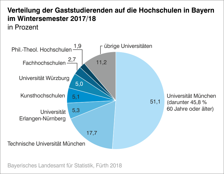 Im Wintersemester 2017/18 waren an den Hochschulen in Bayern neben 389 157 ordentlichen Studierenden auch 4 400 Gasthörer eingeschrieben, die Weiterbildungsmöglichkeiten als Gast an einer Hochschule nutzten. Wie das Bayerische Landesamt für Statistik weiter mitteilt, waren dies 166 Gasthörer weniger als im Wintersemester 2016/17. Die Zahl der ausländischen Gasthörer sank um 42,4 Prozent. Über die Hälfte aller Gasthörer (60,8 Prozent) waren 60 Jahre alt oder älter. Das Durchschnittsalter lag bei 54,9 Jahren.