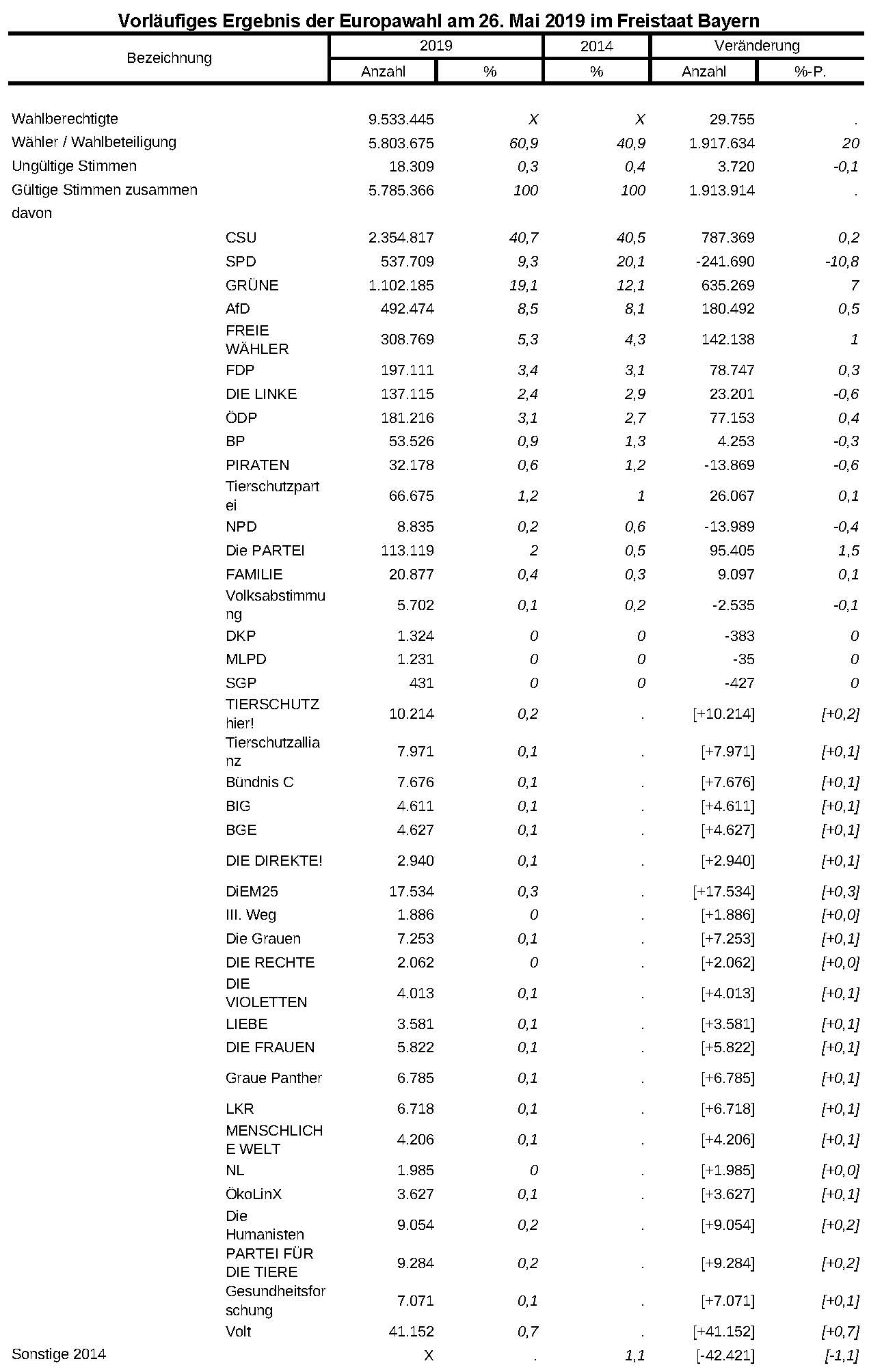 Die Bayern haben gewählt! Nach dem vorläufigen amtlichen Ergebnis der Europawahl in Bayern kam die CSU auf 40,7 Prozent, die GRÜNEN auf 19,1 Prozent, die SPD auf 9,3 Prozent und die AfD auf 8,5 Prozent der gültigen Stimmen. FREIE WÄHLER und FDP erzielten Stimmenanteile von 5,3 bzw. 3,4 Prozent. Die Wahlbeteiligung betrug 60,9 Prozent. Detaillierte Ergebnisse sind im Internetangebot des Landeswahlleiters unter www.europawahl2019.bayern.de abrufbar.