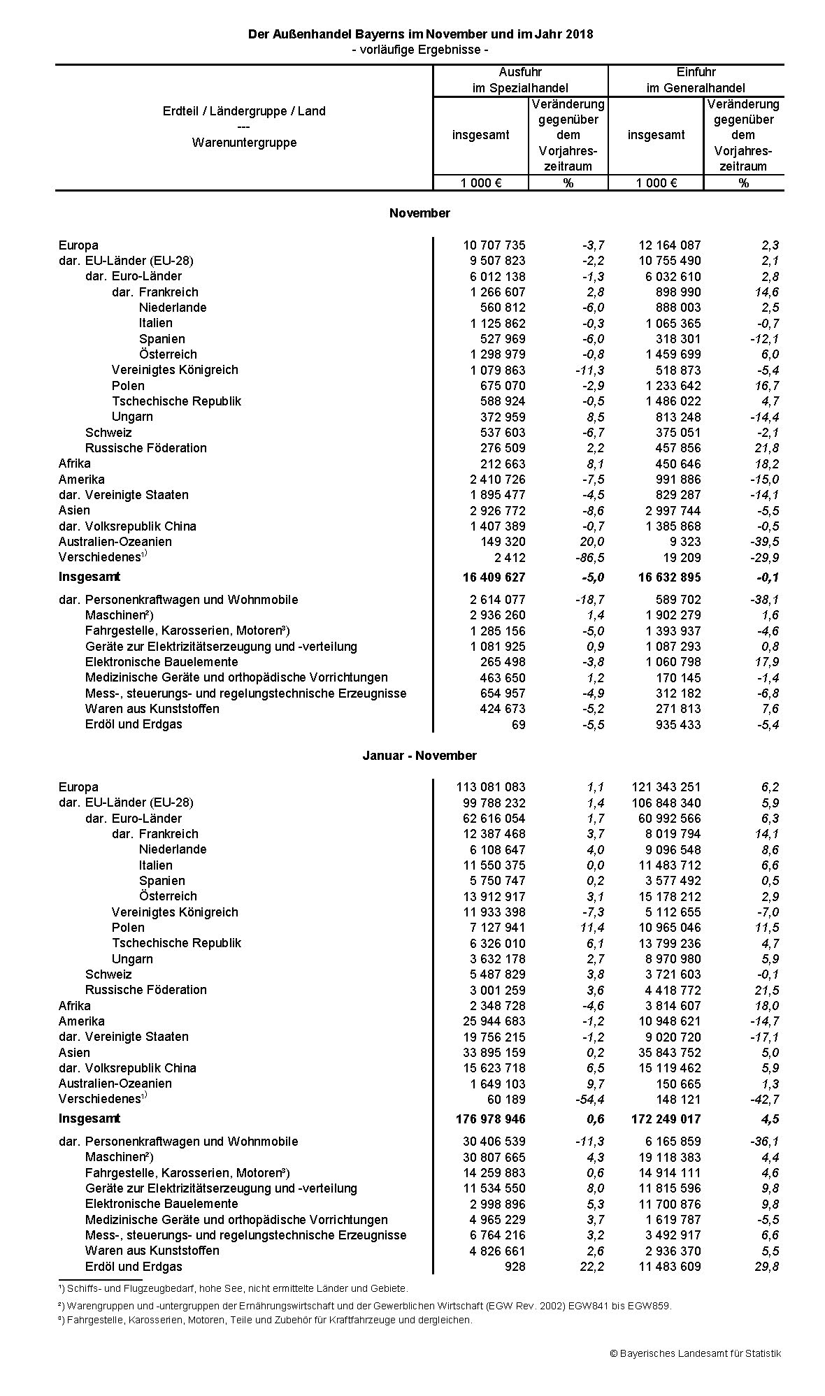 Nach den vorläufigen Ergebnissen des Bayerischen Landesamts für Statistik exportierte die bayerische Wirtschaft im November 2018 Waren im Wert von 16,4 Milliarden Euro, dies sind 5,0 Prozent weniger als im Vorjahresmonat. Zeitgleich importierte sie Waren im Wert von 16,6 Milliarden Euro, dies entspricht einem Minus von 0,1 Prozent. – In den ersten elf Monaten 2018 wuchsen die bayerischen Exporte um 0,6 Prozent auf 177,0 Milliarden Euro, die Importe stiegen um 4,5 Prozent auf 172,2 Milliarden Euro.