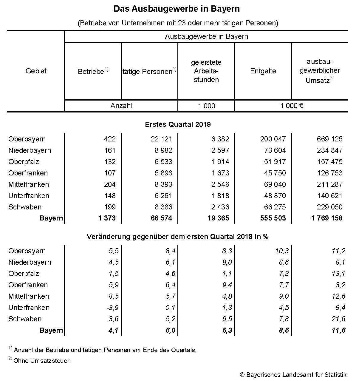 Im bayerischen Ausbaugewerbe waren Ende März 2019 insgesamt 66 574 Personen tätig (+6,0 Prozent), die im ersten Quartal 2019 insgesamt 19,4 Millionen Stunden gearbeitet haben (+6,3 Prozent). Die meisten dieser Arbeitsstunden wurden in den Wirtschaftszweigen „Gas-, Wasser-, Heizungs- sowie Lüftungs- und Klimainstallation“ (34,6 Prozent; +6,5 Prozent) sowie „Elektroinstallation“ (33,6 Prozent; +5,5 Prozent) erbracht. Für das im ersten Quartal 2019 im bayerischen Ausbaugewerbe insgesamt geleistete Arbeitspensum errechnete sich als finanzielles Äquivalent eine Entgeltsumme von insgesamt 555,5 Millionen Euro (+8,6 Prozent), wovon die im erstgenannten Wirtschaftszweig tätigen Personen (24 422 Beschäftigte; +7,9 Prozent) zusammen 206,5 Millionen Euro (+10,9 Prozent) bezogen und die im zweitgenannten Wirtschaftszweig tätigen Personen (21 050 Beschäftigte; +4,6 Prozent) zusammen 174,7 Millionen Euro (+6,5 Prozent).