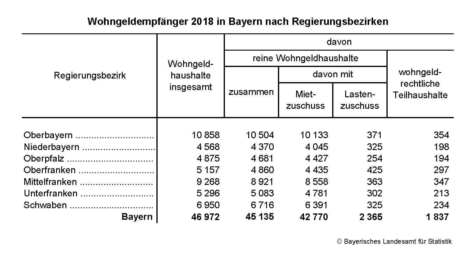 Nach Angaben des Bayerischen Landesamtes für Statistik gab es zum Jahresende 2018 in Bayern insgesamt 45 135 reine Wohngeldhaushalte - das heißt, alle zum Haushalt zählenden Personen waren wohngeldberechtigt. Gegenüber 2017 mit 48 697 Wohngeldhaushalten entspricht dies einem Rückgang von 7,3 Prozent.