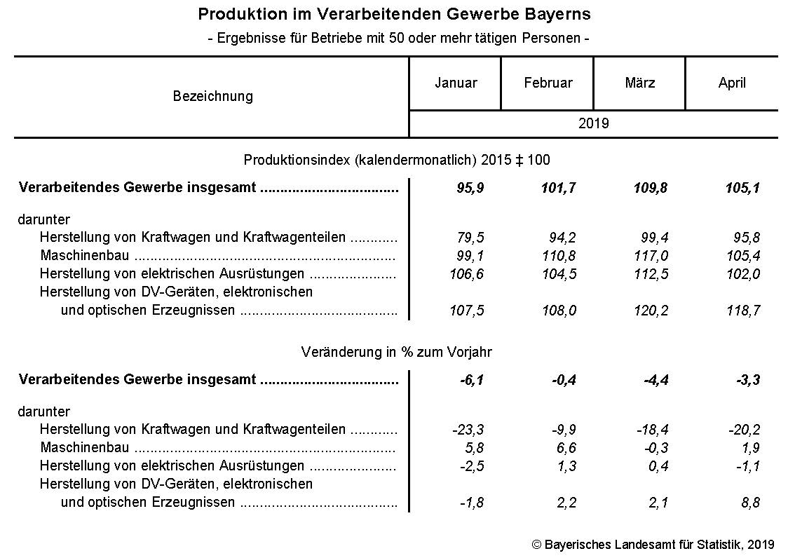 Nach Angaben des Bayerischen Landesamts für Statistik verzeichnete die Produktion des Verarbeitenden Gewerbes im April 2019 gegenüber dem Vorjahresergebnis einen Rückgang von 3,3 Prozent. Die ersten vier Monate des Jahres 2019 erbrachten ein Minus von 3,6 Prozent.