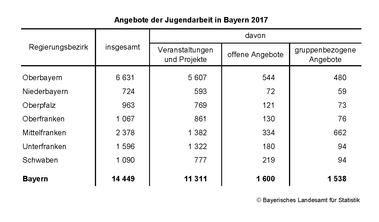 Für das Jahr 2017 wurden für die im zweijährigen Turnus durchzuführende Statistik „Angebote der Jugendarbeit in Bayern“ umfangreiche Daten erhoben. Die Ergebnisse des Bayerischen Landesamts für Statistik zeigen mit insgesamt fast 14 500 Angeboten eine breite und vielseitige Palette. Dabei nahmen die 11 311 Veranstaltungen und Projekte den größten Part ein, gefolgt von 1 600 offenen und 1 538 gruppenbezogenen Angeboten der Jugendarbeit. Es wurden über 1,5 Millionen Kinder und junge Menschen erreicht.  Insgesamt waren hierfür 83 475 Ehrenamtliche im Einsatz.