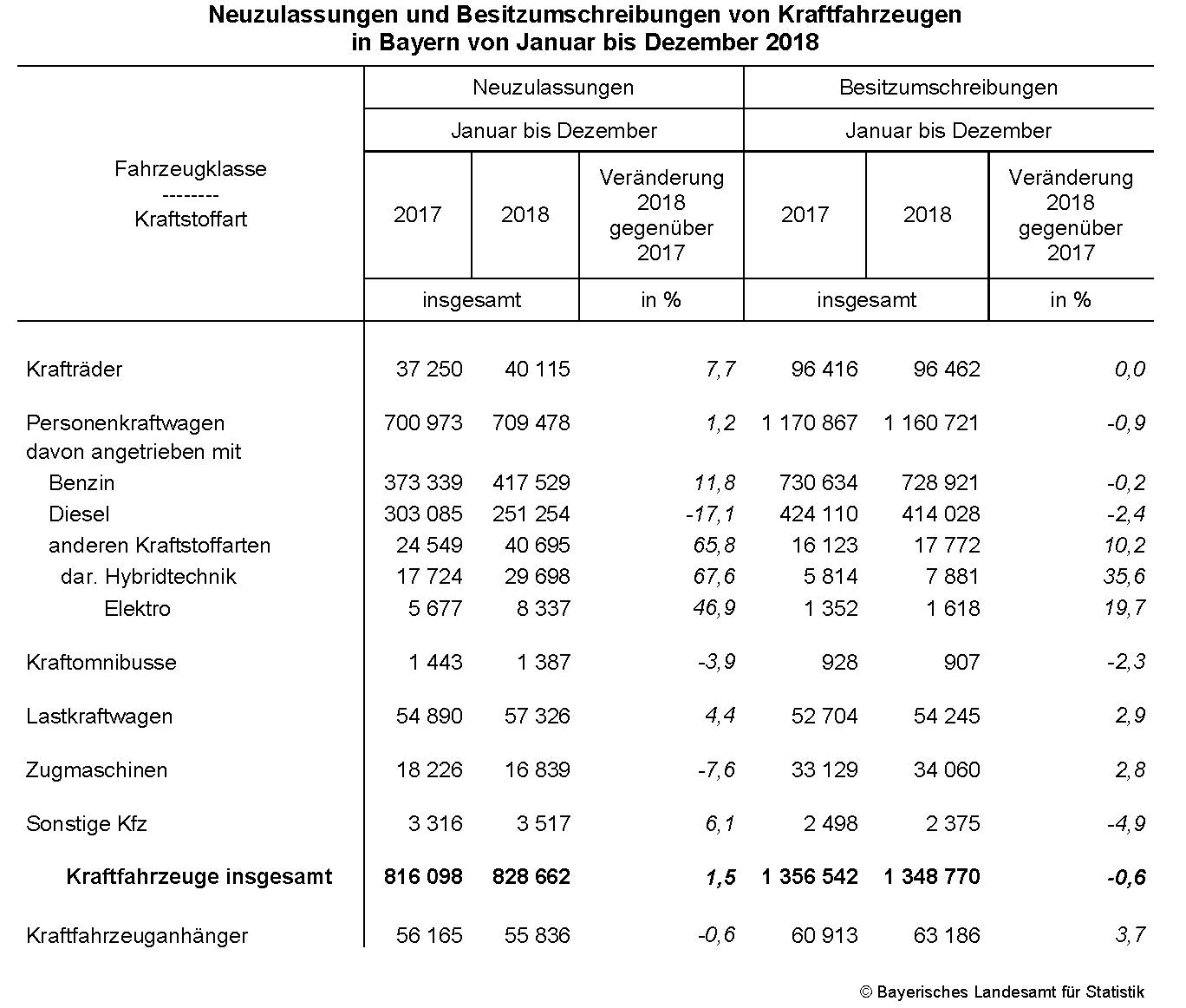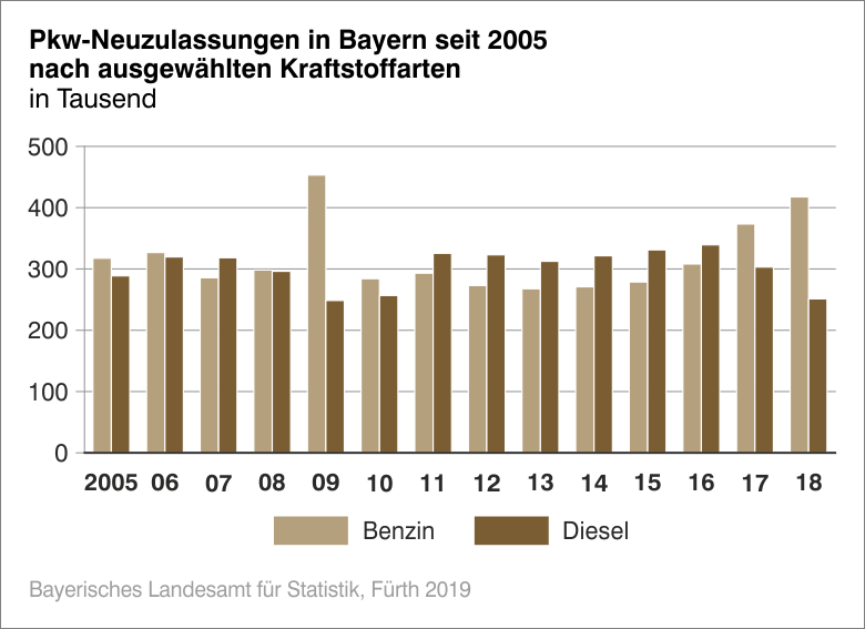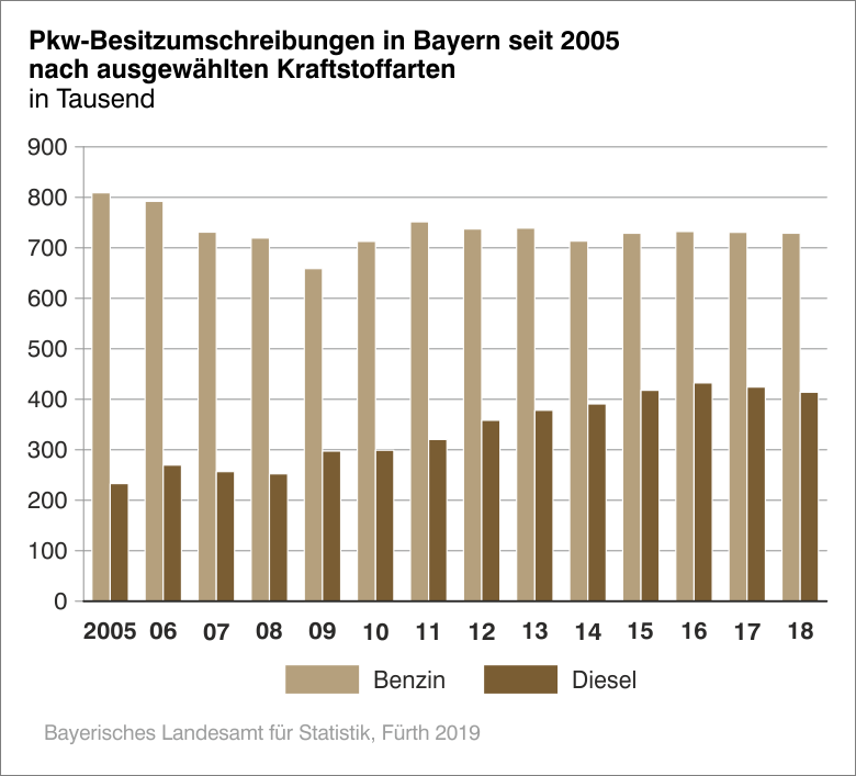 Nach der aktuellen Auswertung der Statistik des Kraftfahrt-Bundesamtes wurden im Jahr 2018 in Bayern 828 662 Kraftfahrzeuge (Kfz) neu zugelassen. Das waren 1,5 Prozent mehr als im Vorjahr. Wie das Bayerische Landesamt für Statistik weiter mitteilt, nahmen die Zulassungszahlen von Personenkraftwagen (Pkw) um 1,2 Prozent auf 709 478 zu. Die Neuzulassungen von Benzinern erhöhten sich um 11,8 Prozent auf 417 529, Diesel-Pkw sind dagegen immer weniger gefragt (251 254, -17,1 Prozent). Die Nachfrage nach anderen Kraftstoffarten (Gas, Elektro, Hybrid) wuchs weiter, und zwar um 65,8 Prozent auf 40 695 neu zugelassene Fahrzeuge. – Besitzumschreibungen sanken um 0,6 Prozent auf 1 348 770 Kfz.