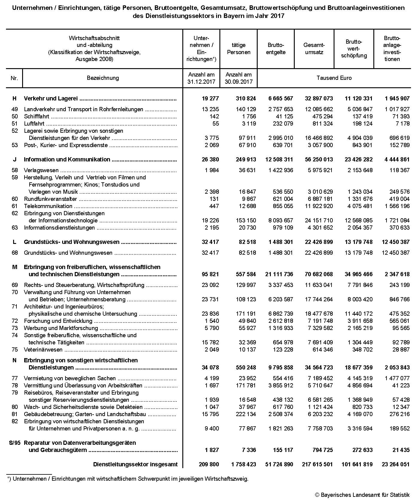 Der Dienstleistungssektor in Bayern erwirtschaftete im Jahr 2017 einen Gesamtumsatz von über 217,6 Milliarden Euro (+4,4 Prozent gegenüber der Erhebung 2016). 32 Prozent des Gesamtumsatzes wurden im Wirtschaftsabschnitt „Erbringung von freiberuflichen, wissenschaftlichen und technischen Dienstleistungen“ (70,7 Milliarden Euro; +10,5 Prozent gegenüber dem Vorjahr) erzielt und 26 Prozent im Abschnitt „Information und Kommunikation“ (56,3 Milliarden Euro; +7,1 Prozent); 16 Prozent des Gesamtumsatzes entfielen auf den Abschnitt „Erbringung von sonstigen wirtschaftlichen Dienstleistungen“ (34,6 Milliarden Euro; +1,2 Prozent), 15 Prozent auf den Abschnitt „Verkehr und Lagerei“ (32,9 Milliarden Euro; -8,3 Prozent), zehn Prozent auf den Abschnitt „Grundstücks- und Wohnungswesen“ (22,4 Milliarden Euro; +6,3 Prozent) und 0,4 Prozent auf die Wirtschaftsabteilung „Reparatur von Datenverarbeitungsgeräten und Gebrauchsgütern“ (0,8 Milliarden Euro; +10,8 Prozent).