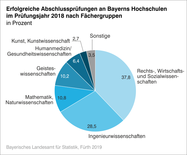 Wie das Bayerische Landesamt für Statistik mitteilt, wurden im Prüfungsjahr 2018 an den Hochschulen in Bayern insgesamt 79 874 Abschlussprüfungen erfolgreich abgelegt. Damit meldeten die Prüfungskanzleien 0,3 Prozent weniger bestandene Prüfungen als in der Vorperiode. - Mit dem erfolgreichen Abschluss der Promotion erwarben 2 202 Akademikerinnen und 2 529 Akademiker einen Doktortitel.