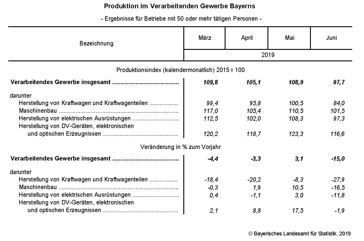 Nach Angaben des Bayerischen Landesamts für Statistik wurde die Produktion des Verarbeitenden Gewerbes im Juni 2019 gegenüber dem Vorjahresergebnis um 15,0 Prozent verringert. Die ersten sechs Monate des Jahres 2019 erbrachten ein Minus von 4,5 Prozent.