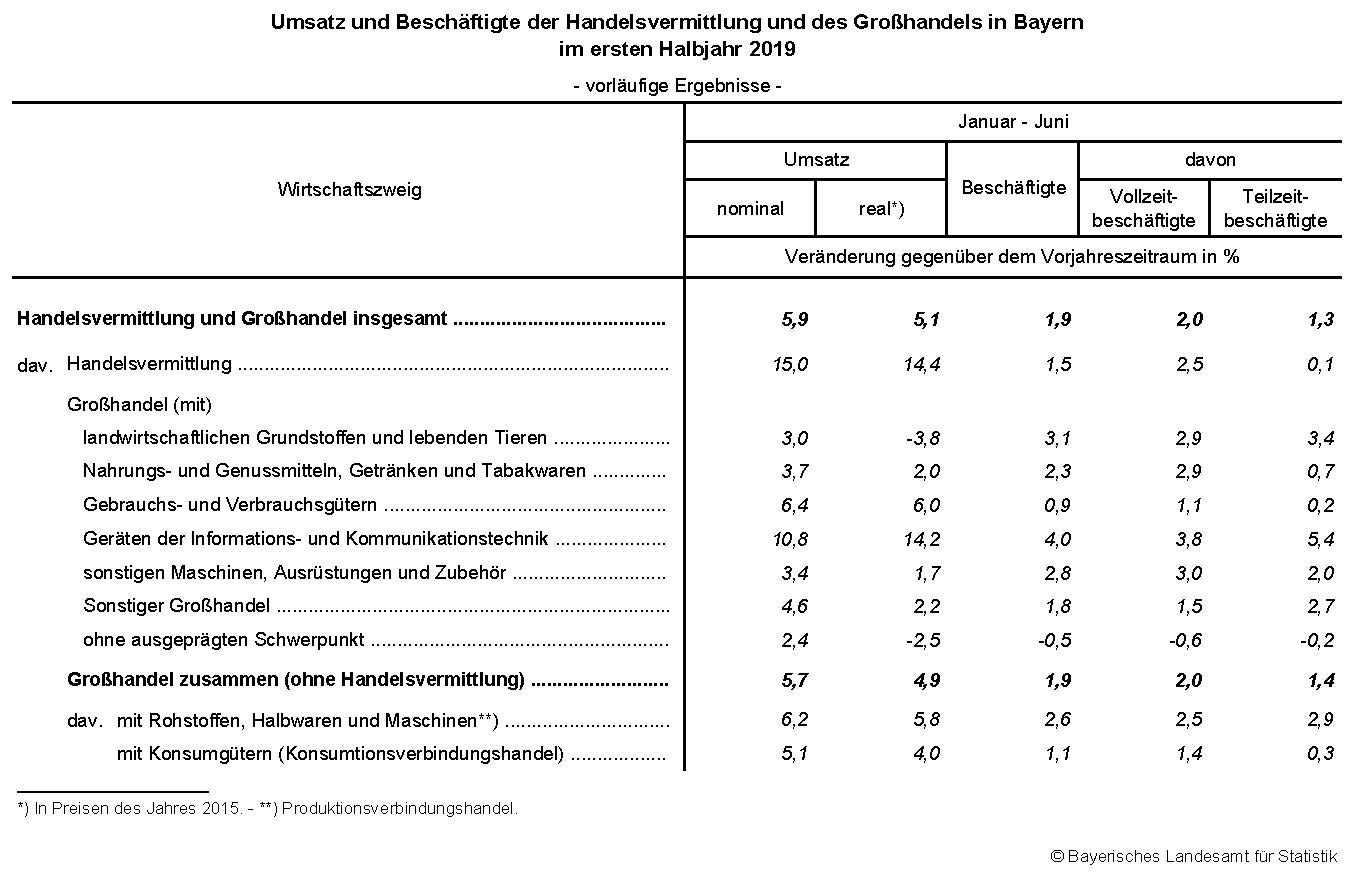 Der Umsatz des bayerischen Großhandels (einschl. der Handelsvermittlung) wuchs im ersten Halbjahr 2019 gegenüber dem Vorjahreszeitraum nominal um 5,9 Prozent und real um 5,1 Prozent*). Wie das Bayerische Landesamt für Statistik nach den vorläufigen Ergebnissen der Monatsstatistik im Großhandel und in der Handelsvermittlung weiter berichtet, erhöhte sich die Zahl der Beschäftigten des Großhandels um 1,9 Prozent, davon stieg die Zahl der Vollzeitbeschäftigten um 2,0 Prozent und die Zahl der Teilzeitbeschäftigten um 1,3 Prozent.