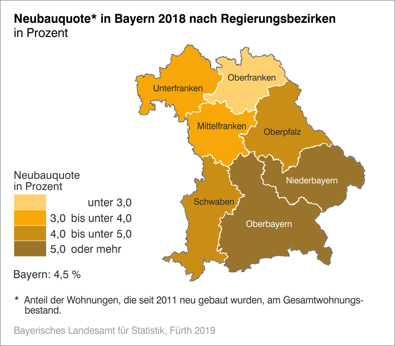Wohnungen, die seit 2011 neu gebaut wurden, hatten in Bayern 2018 einen Anteil von 4,5 Prozent am Gesamtwohnungsbestand und lagen damit über dem gesamtdeutschen Wert von 2,9 Prozent. Der Regierungsbezirk in Bayern mit dem höchsten Anteil an Wohnungen, die ab 2011 gebaut wurden, ist mit 5,9 Prozent Niederbayern. Oberfranken weist mit 2,0 Prozent den geringsten Anteil auf. Die weiteren Regierungsbezirke haben gemessen an den seit 2011 errichteten Wohnungen folgende Neubauquoten: Oberbayern 5,3 Prozent, Oberpfalz 4,4 Prozent, Schwaben 4,3 Prozent, Mittelfranken 3,9 Prozent und Unterfranken 3,2 Prozent.