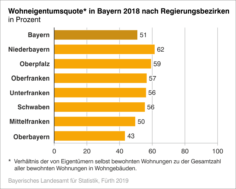 Wie im Jahr 2010 weisen die stärker urban geprägten Regierungsbezirke Oberbayern und Mittelfranken die niedrigsten Wohneigentumsquoten unter den bayerischen Regierungsbezirken auf. In Oberbayern liegt diese bei 43 Prozent, in Mittelfranken bei 50 Prozent. Im Vergleich zum Jahr 2010 ist in Mittelfranken die Eigentumsquote um 2,3 Prozentpunkte gestiegen, in Oberbayern ist die Quote nahezu unverändert geblieben. Demgegenüber lag die Wohneigentumsquote in allen anderen Regierungsbezirken über dem bayerischen Landesdurchschnitt. Spitzenreiter war Niederbayern mit einer Wohneigentumsquote von 62 Prozent, gefolgt von der Oberpfalz mit 59 Prozent und Oberfranken mit 57 Prozent. In Unterfranken und Schwaben lagen die Eigentumsquoten jeweils bei 56 Prozent.