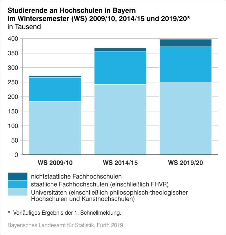 Im Zehnjahres-Vergleich hat die Zahl der Studierenden in Bayern seit dem Wintersemester 2009/10 (272 666 Studierende) um insgesamt 46,0 Prozent zugenommen. Dabei weisen im Vergleich zum aktuellen Semester die Universitäten einen Anstieg der Studierendenzahlen von 36,4 Prozent (+65 709) auf. Bei den Fachhochschulen (inkl. der Hochschulen für den öffentlichen Dienst) ist ein Plus von 67,0 Prozent zu verzeichnen, was 59 242 Studierenden entspricht.