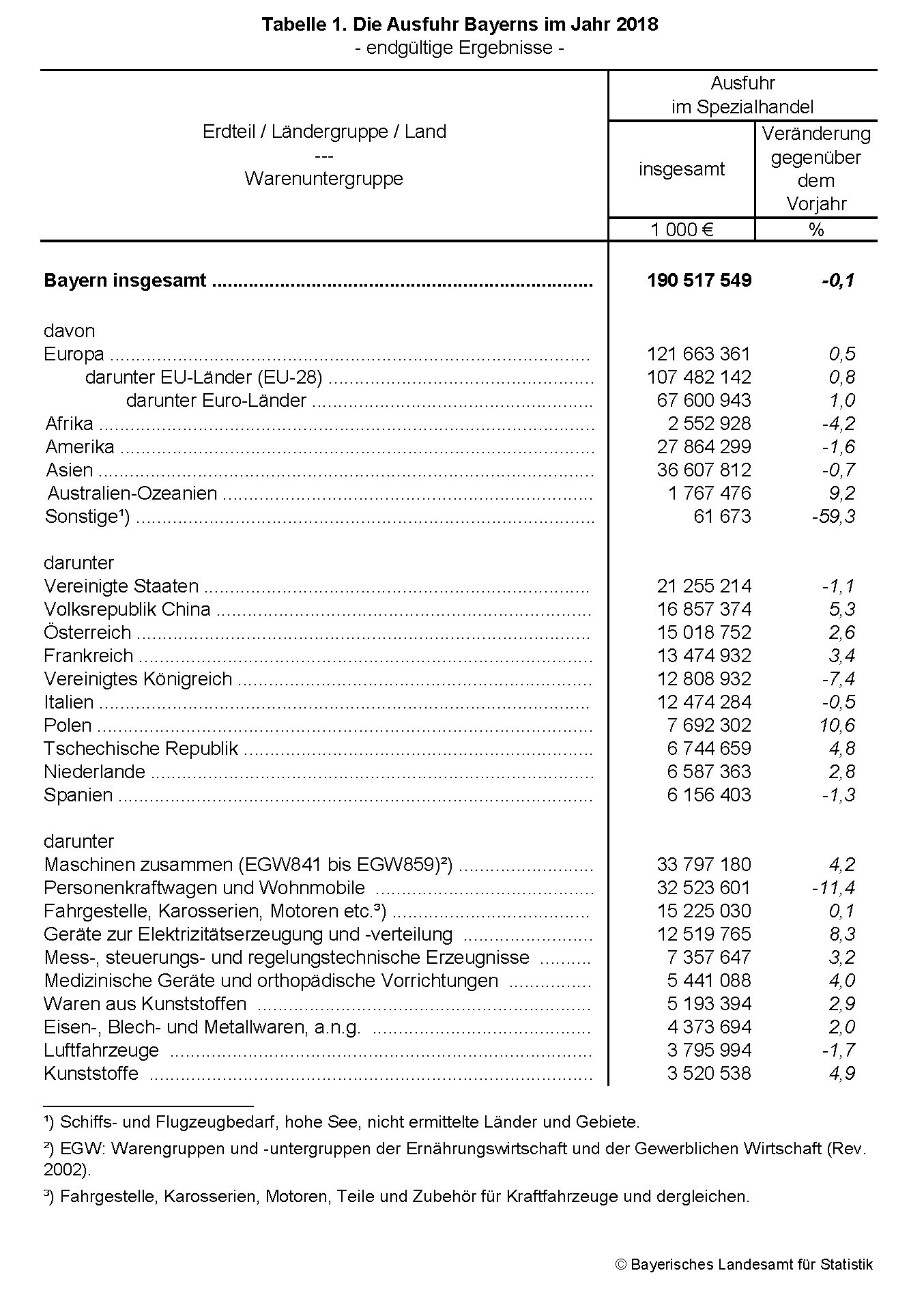 Wie das Bayerische Landesamt für Statistik nach den endgültigen Ergebnissen der Außenhandelsstatistik mitteilt, exportierte die bayerische Wirtschaft im Jahr 2018 Waren im Wert von 190,5 Milliarden Euro, dies sind 0,1 Prozent weniger als im Jahr 2017. Zeitgleich importierte sie Waren im Wert von 188,8 Milliarden Euro (+5,3 Prozent). Die Vereinigten Staaten, die Volksrepublik China und Österreich waren die wichtigsten Exportländer der bayerischen Wirtschaft, die Volksrepublik China, Österreich und die Tschechische Republik die wichtigsten Importländer. Den höchsten Exportwert und den höchsten Importwert erzielte Bayerns Wirtschaft im Jahr 2018 jeweils mit „Maschinen“.