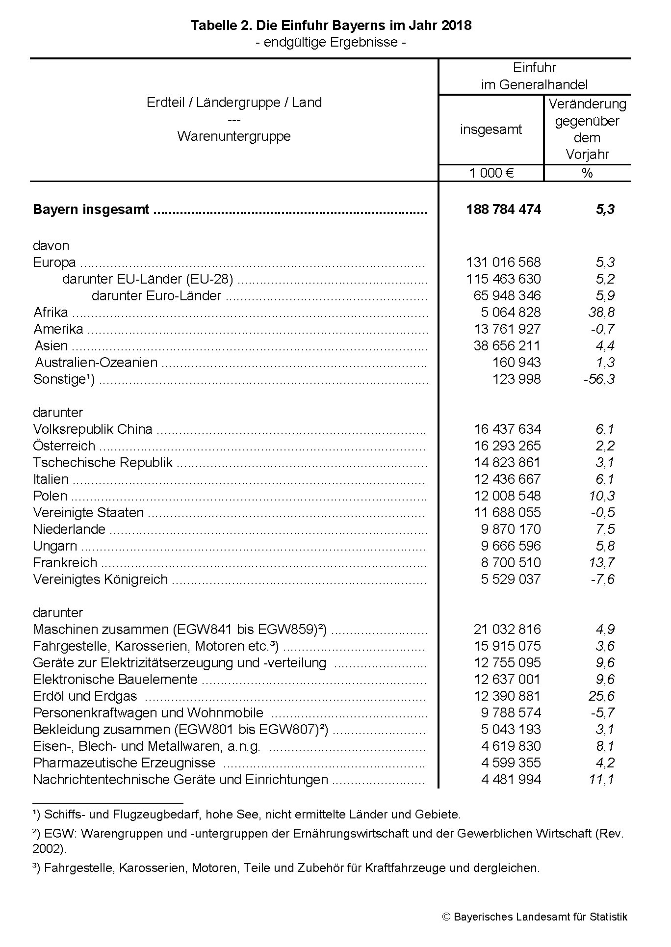 Nach den vorliegenden, endgültigen Ergebnissen des Bayerischen Landesamts für Statistik verringerten sich die Exporte der bayerischen Wirtschaft im Jahr 2018 geringfügig um 0,1 Prozent auf rund 190,5 Milliarden Euro. Die Importe stiegen zeitgleich um 5,3 Prozent auf knapp 188,8 Milliarden Euro.