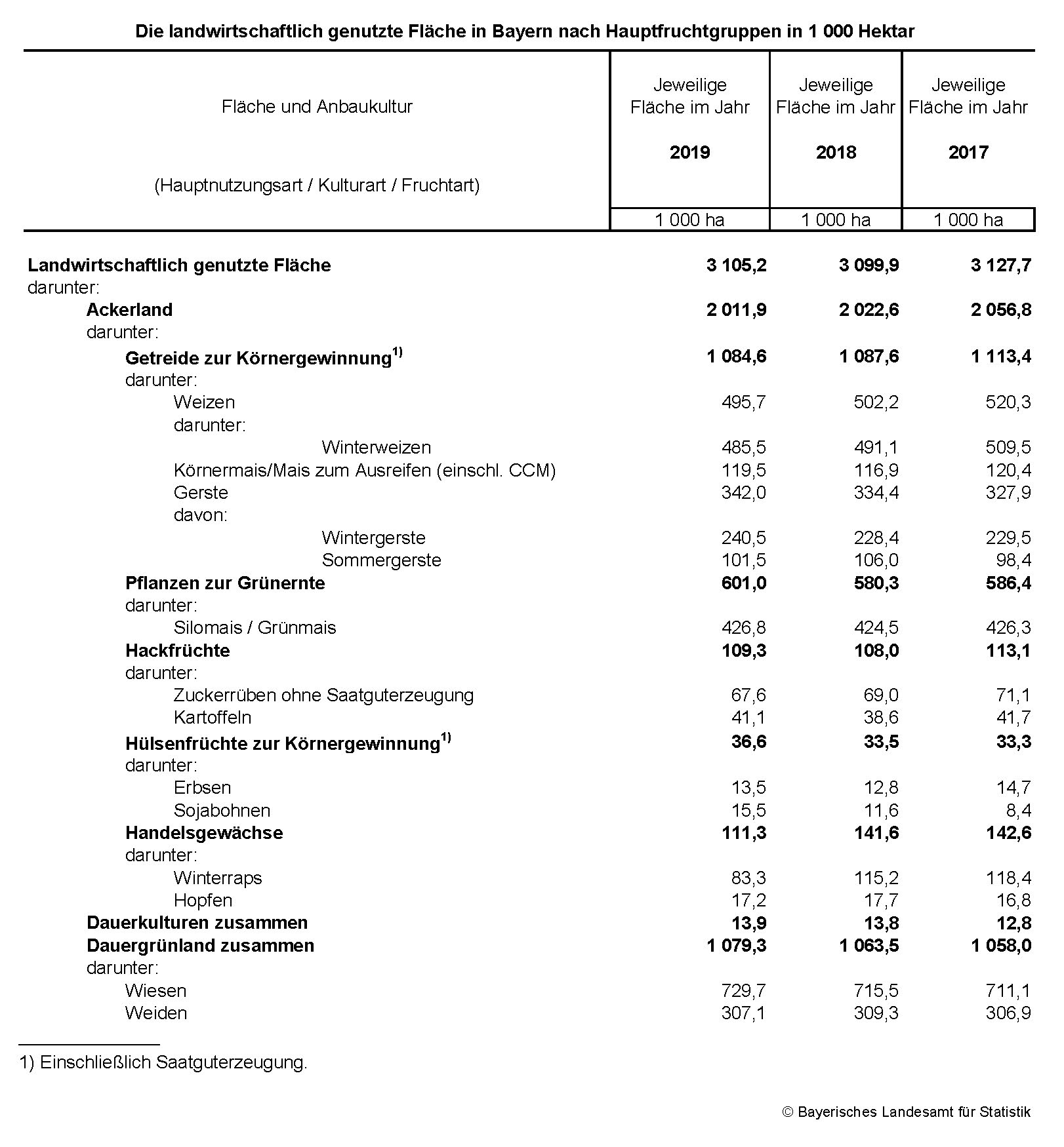 Wie das Bayerische Landesamt für Statistik mitteilt, beträgt die landwirtschaftlich genutzte Fläche nach den endgültigen Ergebnissen der repräsentativen Bodennutzungshaupterhebung 2019 rund 3 105 200 Hektar. Davon entfallen 2 011 900 Hektar auf Ackerland, 1 079 300 Hektar auf Dauergrünland und 13 900 Hektar auf Dauerkulturen.