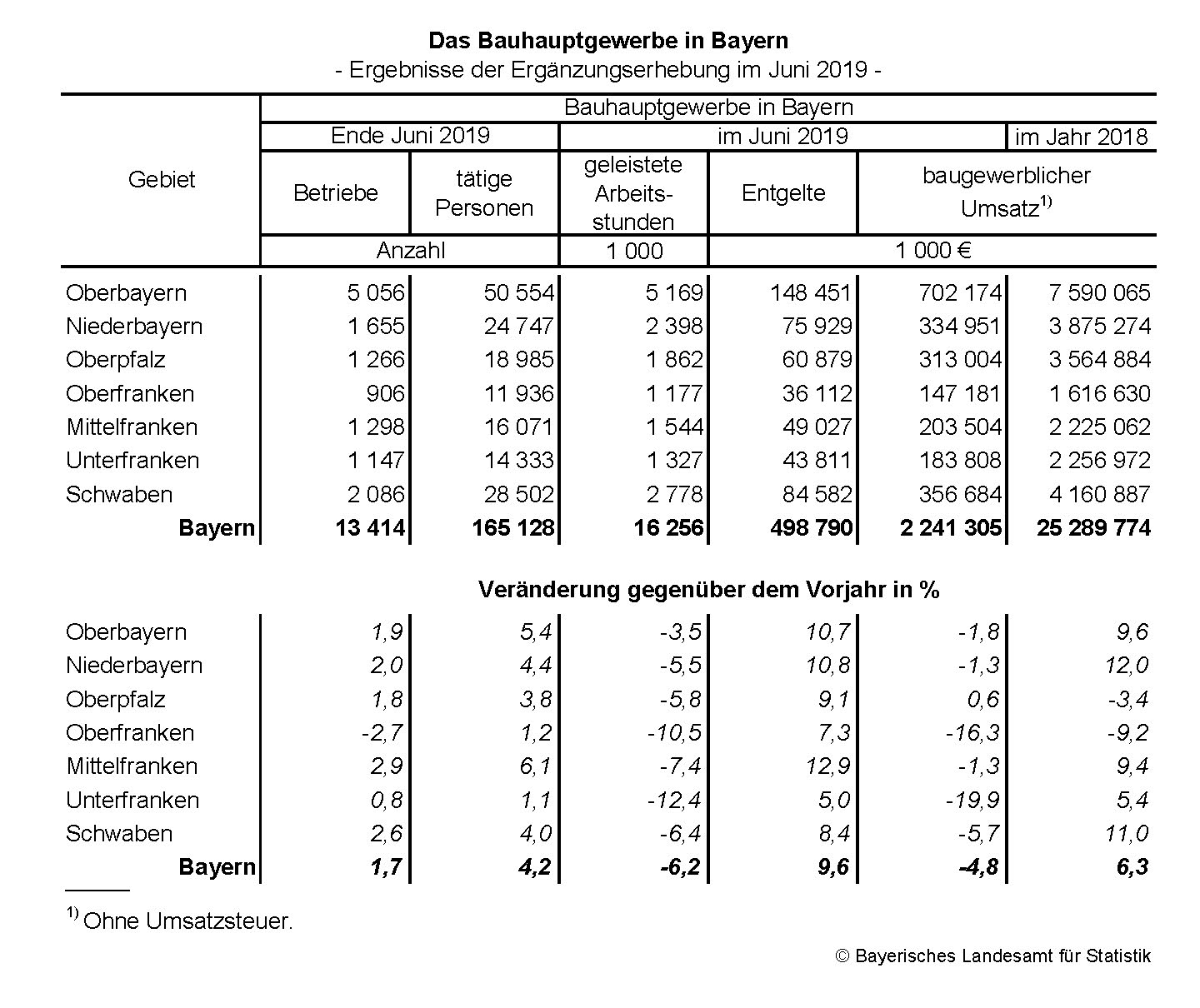 Wie das Bayerische Landesamt für Statistik nach Ergebnissen der jüngsten betrieblichen Strukturerhebung im Bauhauptgewerbe mitteilt, gab es in Bayern Ende Juni 2019 insgesamt 13 414 bauhauptgewerbliche Betriebe mit zusammen 165 128 tätigen Personen (+1,7 Prozent bzw. +4,2 Prozent gegenüber Ende Juni 2018). Der von diesen Betrieben und tätigen Personen erzielte baugewerbliche Umsatz belief sich im Jahr 2018 auf insgesamt 25,29 Milliarden Euro und im Juni 2019 auf insgesamt 2,24 Milliarden Euro (+6,3 Prozent bzw. -4,8 Prozent gegenüber dem jeweiligen Vorjahreszeitraum). Das im bayerischen Bauhauptgewerbe im Juni 2019 geleistete Arbeitspensum bezifferte sich auf insgesamt 16,26 Millionen Arbeitsstunden und die Entgelte in Summe auf 498,79 Millionen Euro (-6,2 Prozent bzw. +9,6 Prozent).