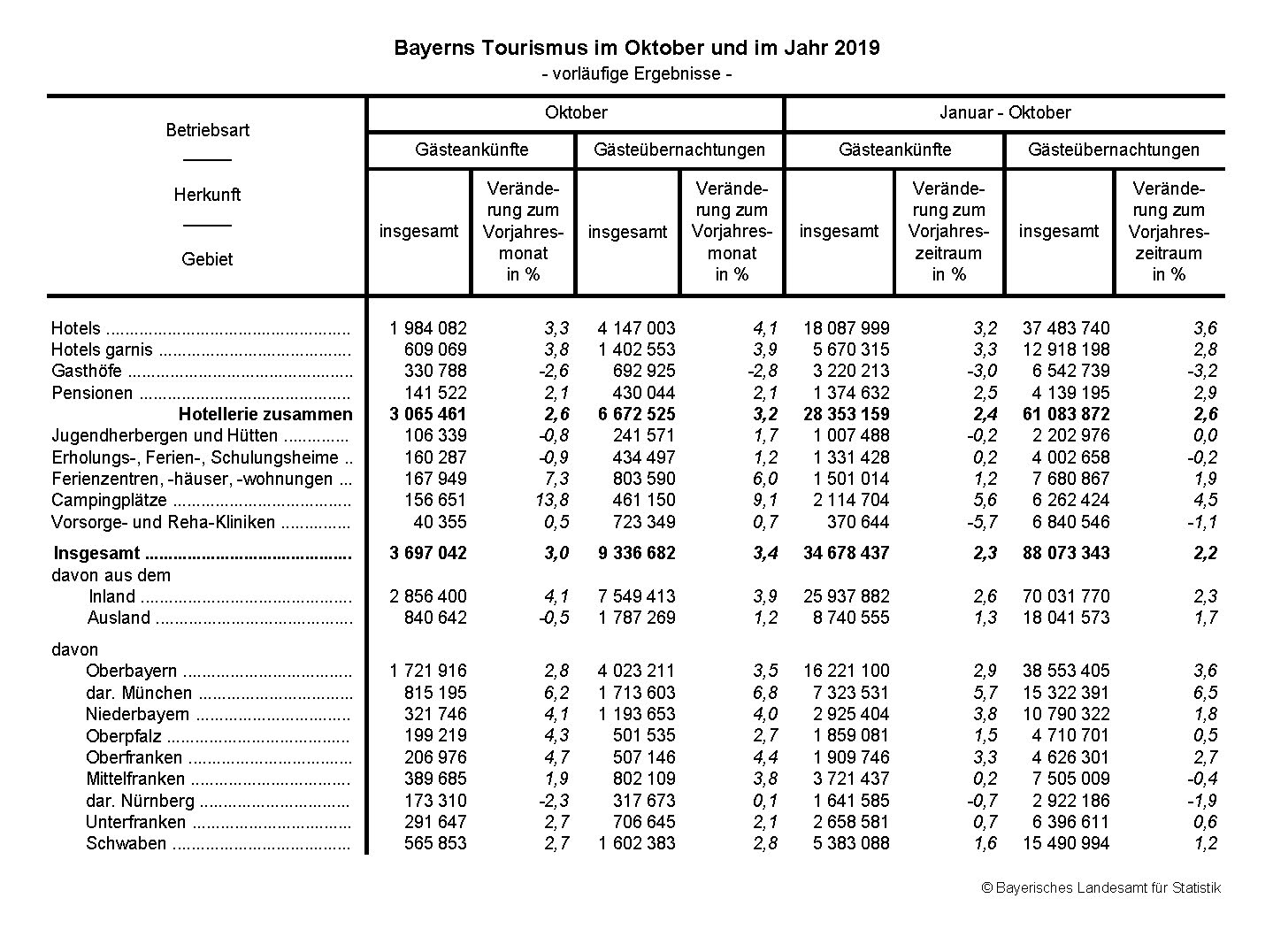 In den Monaten von Januar bis Oktober 2019 nahm die Zahl der Gästeankünfte in Bayern gegenüber dem Vorjahreszeitraum um 2,3 Prozent auf knapp 34,7 Millionen, die Zahl der Übernachtungen um 2,2 Prozent auf rund 88,1 Millionen zu.
