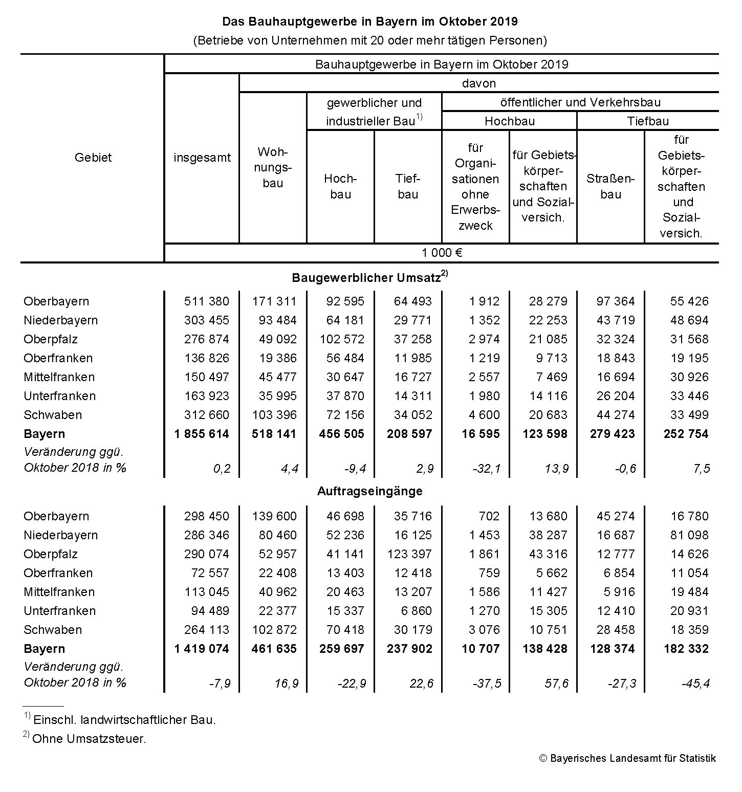 Nach Angaben des Bayerischen Landesamts für Statistik erzielte das Bauhauptgewerbe in Bayern im Oktober 2019 einen baugewerblichen Umsatz in Höhe von 1,86 Milliarden Euro und damit ein Umsatzergebnis schwach über Vorjahresniveau (+0,2 Prozent gegenüber Oktober 2018). Zu einer positiven Umsatzentwicklung haben bei regionaler Betrachtung vier von sieben Regierungsbezirken und bei Branchenbetrachtung vier von sieben Bausparten beigetragen. Den relativ stärksten Umsatzanstieg erfuhr unter den Regierungsbezirken Mittelfranken (+11,5 Prozent auf 150,5 Millionen Euro) und unter den Bausparten der öffentliche Hochbau für Gebietskörperschaften und Sozialversicherungen (+13,9 Prozent auf 123,6 Millionen Euro). Der Gesamtwert der Auftragseingänge im bayerischen Bauhauptgewerbe bezifferte sich Ende Oktober 2019 auf 1,42 Milliarden Euro (-7,9 Prozent) und der Personalstand auf insgesamt 99 249 tätige Personen (+5,5 Prozent).