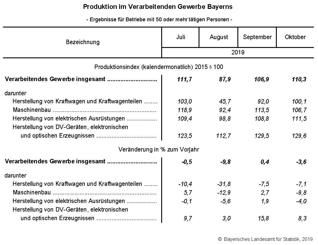 Nach Angaben des Bayerischen Landesamts für Statistik wurde die Produktion des Verarbeitenden Gewerbes in Bayern im Oktober 2019 gegenüber dem Vorjahresergebnis um 3,6 Prozent verringert. Die ersten zehn Monate des Jahres 2019 erbrachten ein Minus von 4,0 Prozent.