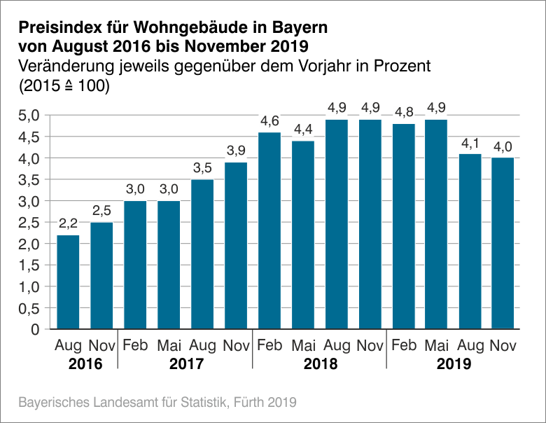 Wie das Bayerische Landesamt für Statistik mitteilt, erreichte der Preisindex für den Neubau von Wohngebäuden in Bayern im November 2019 einen Stand von 116,5 (2015≙100). Im Vergleich zum entsprechenden Vorjahresmonat entspricht dies einer durchschnittlichen Preissteigerung von 4,0 Prozent.