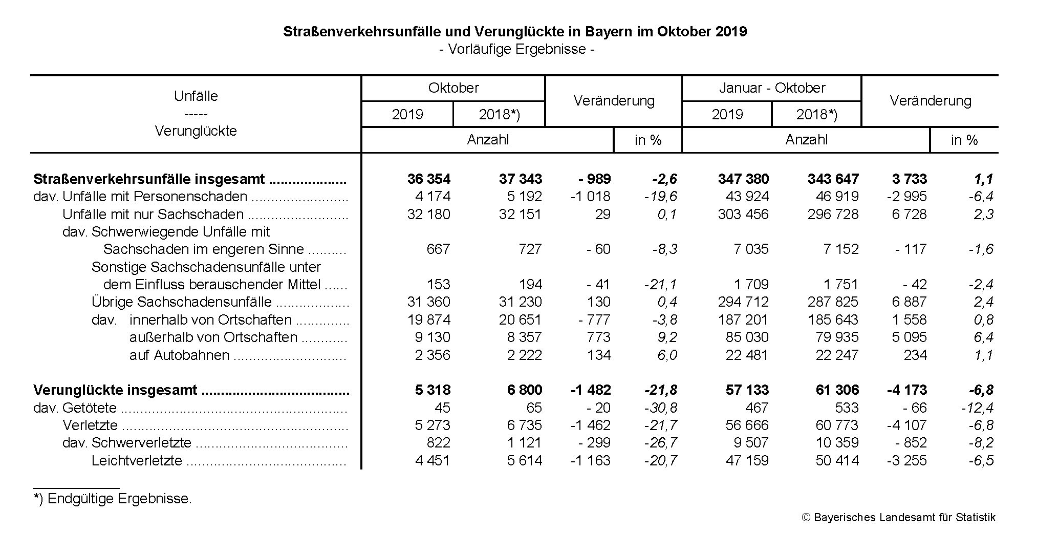Die Zahl der Verunglückten betrug im Oktober 2019 insgesamt 5 318 Verkehrsteilnehmer und lag damit 21,8 Prozent unter dem Vorjahresmonat. Es ereigneten sich 45 Todesfälle (-30,8 Prozent), 822 Personen wurden schwer (-26,7 Prozent) und 4 451 leicht verletzt