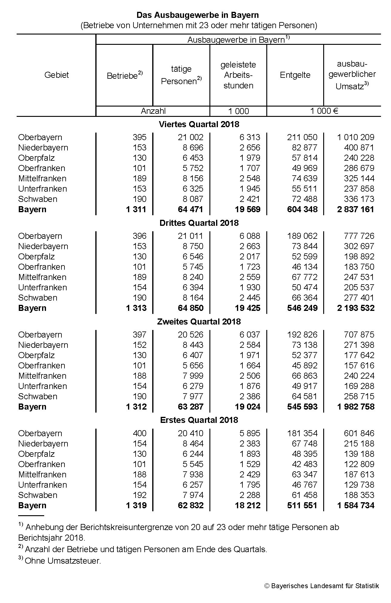 Ende Dezember 2018 waren in den 1 311 maßgeblichen ausbaugewerblichen Betrieben in Bayern insgesamt 64 471 Personen tätig. Für die von diesen Beschäftigten im vierten Quartal 2018 zusammen geleisteten 19,57 Millionen Arbeitsstunden wurden Entgelte in Summe von 604,35 Millionen Euro gezahlt.