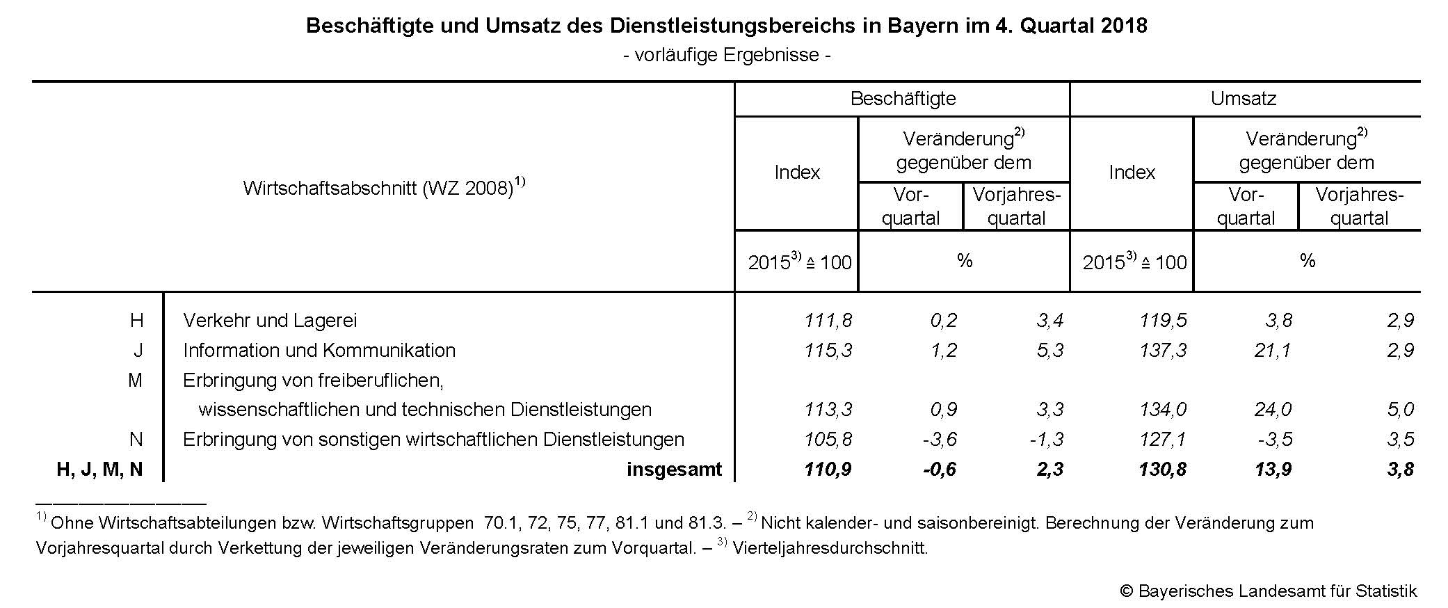 Die Zahl der Beschäftigten des Dienstleistungsbereichs in Bayern erhöhte sich im vierten Quartal 2018 gegenüber dem Vorjahreszeitraum um 2,3 Prozent. Im Abschnitt J „Information und Kommunikation“ nahm sie um 5,3 Prozent zu, im Abschnitt H „Verkehr und Lagerei“ um 3,4 Prozent und im Abschnitt M „Erbringung von freiberuflichen, wissenschaftlichen und technischen Dienstleistungen“ um 3,3 Prozent. Im Wirtschaftsabschnitt N „Erbringung von sonstigen wirtschaftlichen Dienstleistungen“ wurden Ende Dezember 2018 1,3 Prozent weniger Beschäftigte gezählt als im Vorjahr.