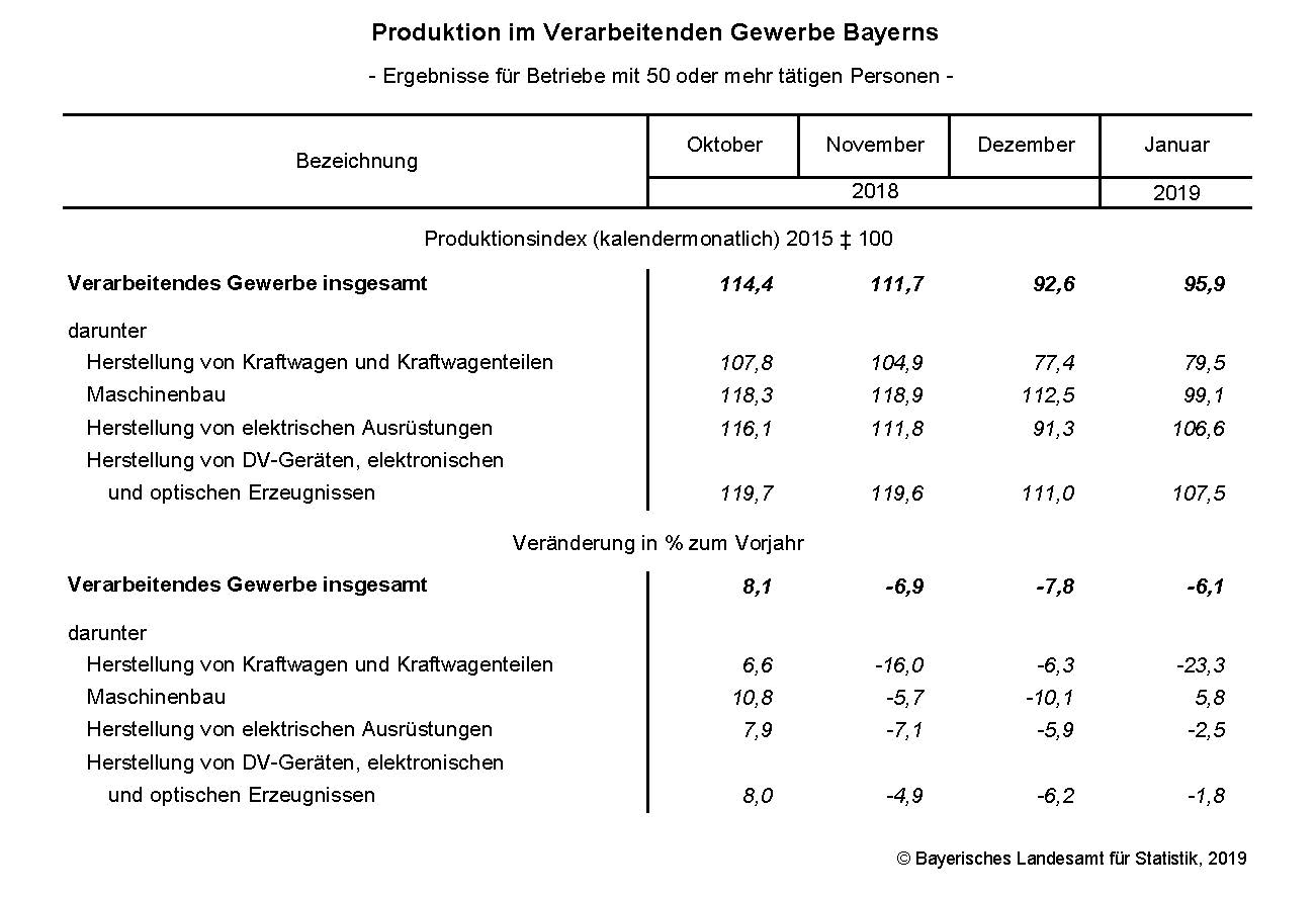 Die Produktion der bayerischen Industrie (Verarbeitendes Gewerbe sowie Bergbau und Gewinnung von Steinen und Erden, bezogen auf den Berichtskreis „Betriebe mit 50 oder mehr Beschäftigten“) verzeichnete im Januar 2019 ein Minus von 6,1 Prozent gegenüber dem Vorjahresergebnis.