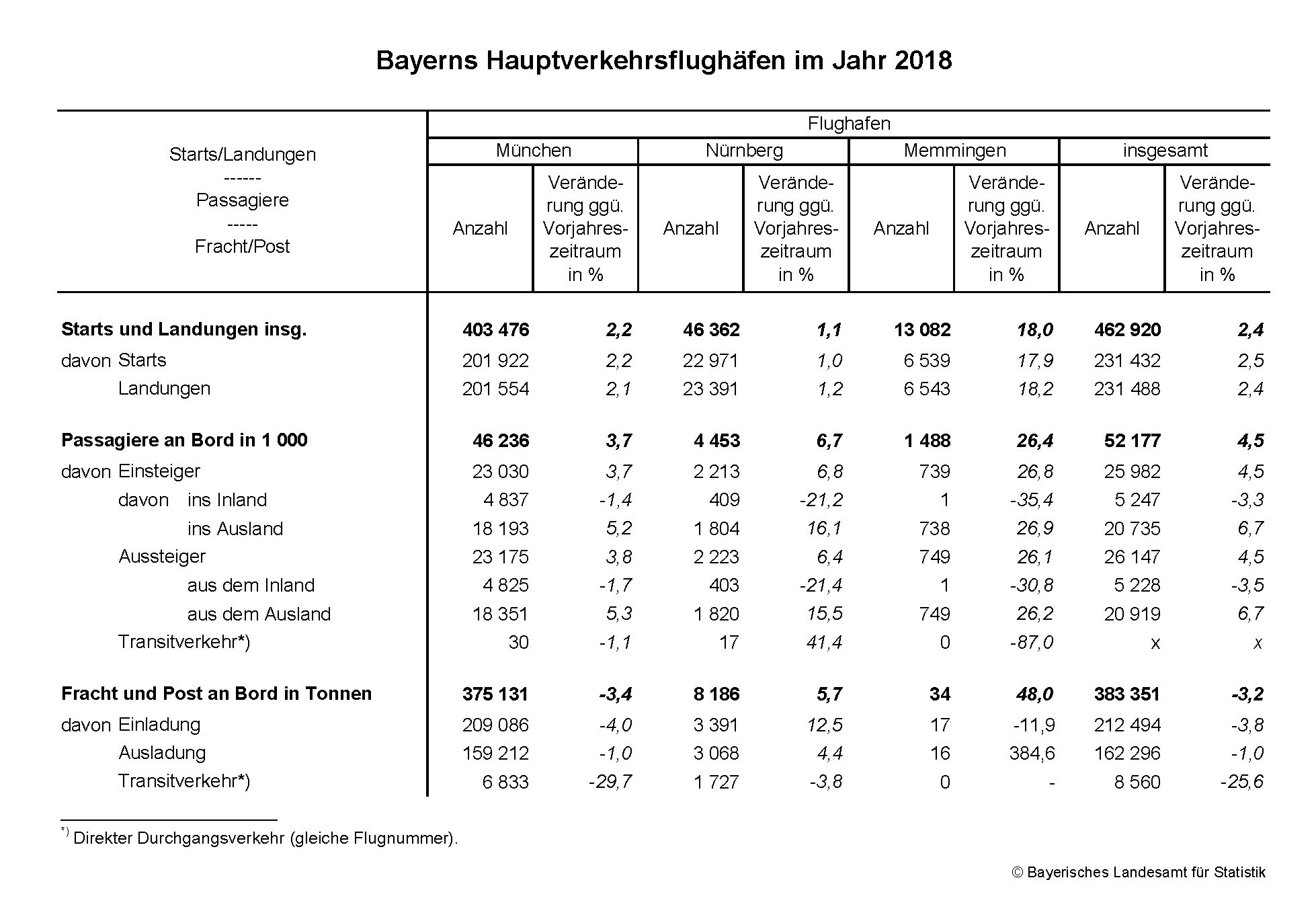Die bayerischen Flughäfen München, Nürnberg und Memmingen meldeten nach Auswertungen des Statistischen Bundesamts im Jahr 2018 insgesamt 52,2 Millionen Passagiere im gewerblichen Luftverkehr (einschl. Transitverkehr). Wie das Bayerische Landesamt für Statistik weiter mitteilt, starteten und landeten dabei fast 463 000 Flugzeuge auf diesen drei Hauptverkehrsflughäfen*).