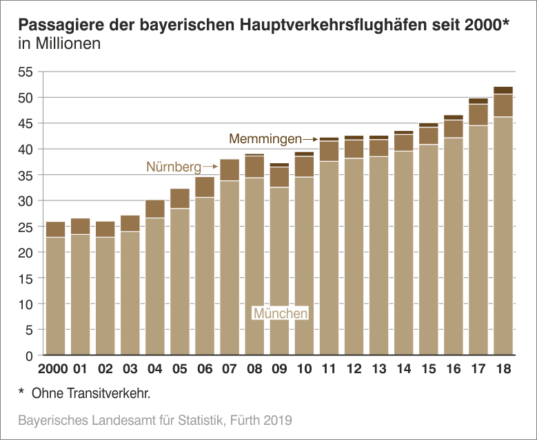 An Bayerns größtem Flughafen München stieg im Jahr 2018 die Zahl der Fluggäste an Bord um 3,7 Prozent auf 46,2 Millionen bei 403 476 Starts und Landungen (+2,2 Prozent). Über drei Viertel der Fluggäste (Ein- und Aussteiger) kamen aus dem Ausland oder flogen ins Ausland. Das Fracht- und Postaufkommen sank um 3,4 Prozent auf 375 131 Tonnen.