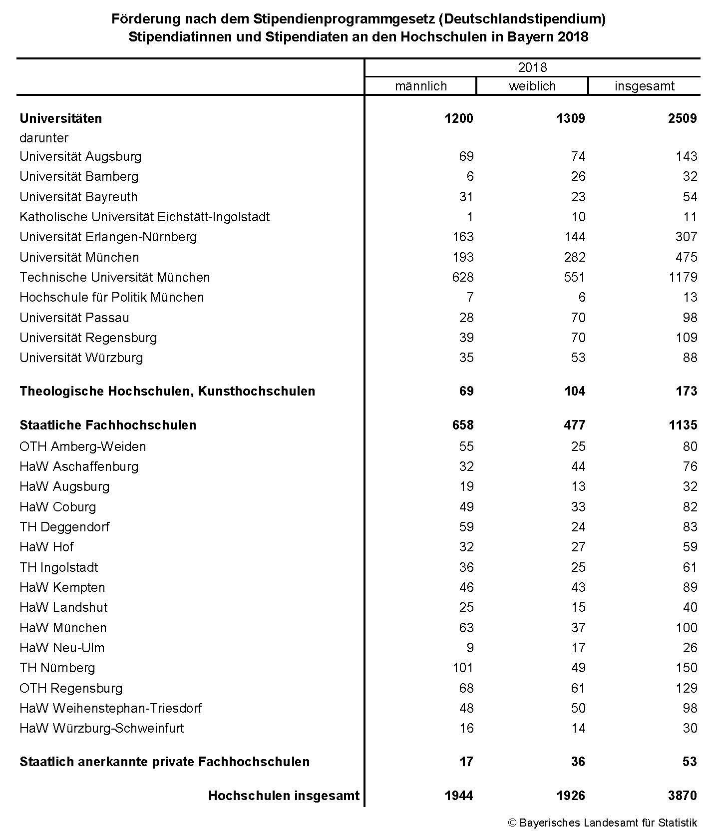 2018 wurden in Bayern 3 870 Studierende mit dem seit 2011 vergebenen Deutschlandstipendium gefördert. Wie das Bayerische Landesamt für Statistik mitteilt, studierten etwa zwei Drittel (64,8 Prozent) der so Geförderten an Universitäten. Knapp die Hälfte der Deutschlandstipendien (49,8 Prozent) wurde an Studentinnen vergeben.