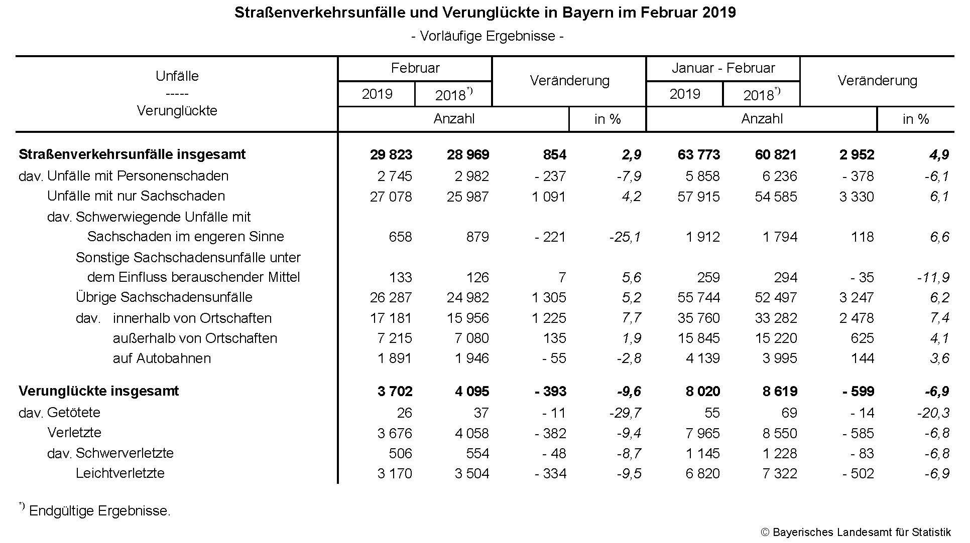 Im Februar 2019 ereigneten sich auf Bayerns Straßen nach den vorläufigen Meldungen der Polizei insgesamt 29 823 Unfälle und somit 2,9 Prozent mehr als im Vorjahresmonat. Nach Mitteilung des Bayerischen Landesamts für Statistik sanken Unfälle mit Personenschaden um 7,9 Prozent, Unfälle mit nur Sachschaden stiegen um 4,2 Prozent. Die Zahl der Verunglückten ging um 9,6 Prozent auf insgesamt 3 702 Fälle zurück. Es wurden 26 Verkehrsteilnehmer getötet (-29,7 Prozent), 506 schwer (-8,7 Prozent) und 3 170 leicht verletzt (-9,5 Prozent).