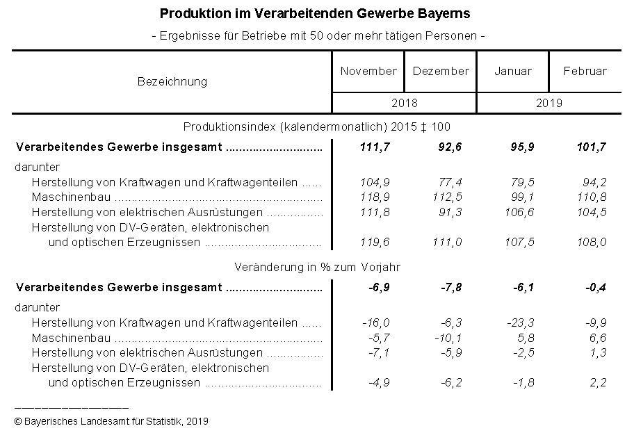 Nach Angaben des Bayerischen Landesamts für Statistik verzeichnete die Produktion des Verarbeitenden Gewerbes im Februar 2019 gegenüber dem Vorjahresergebnis einen leichten Rückgang von 0,4 Prozent. Die ersten beiden Monate des Jahres 2019 erbrachten ein Minus von 3,2 Prozent.