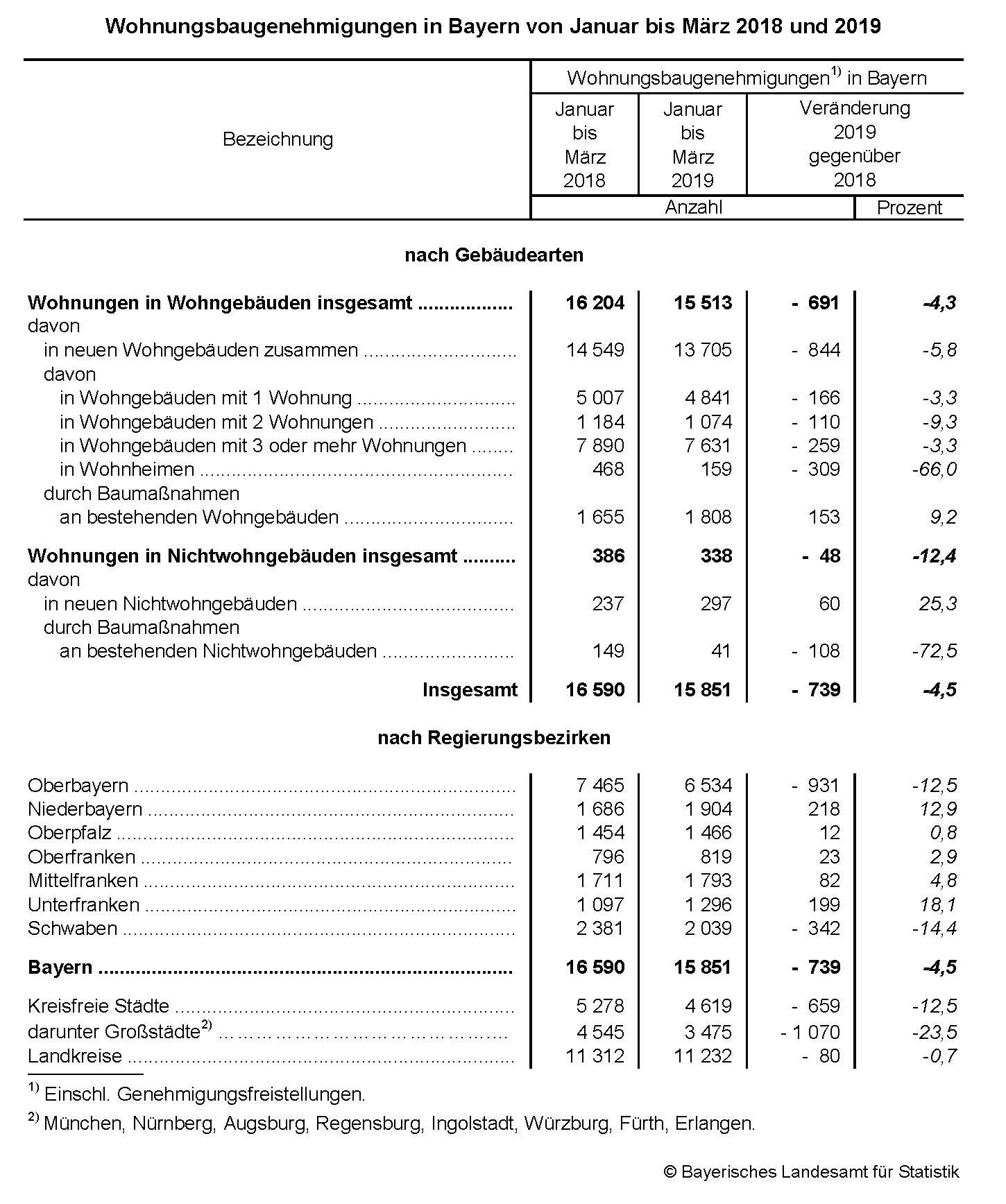 Nach Angaben des Bayerischen Landesamts für Statistik wurden von den Bauaufsichtsbehörden in Bayern im ersten Vierteljahr 2019 insgesamt 15 851 Wohnungsbaugenehmigungen (einschl. Genehmigungsfreistellungen) gemeldet. Dies entspricht einem um 739 Wohnungen bzw. 4,5 Prozent geringeren Genehmigungsvolumen als im ersten Vierteljahr 2018. Während die Anzahl an Wohnungsbaufreigaben in neuen Wohngebäuden zurückgegangen ist