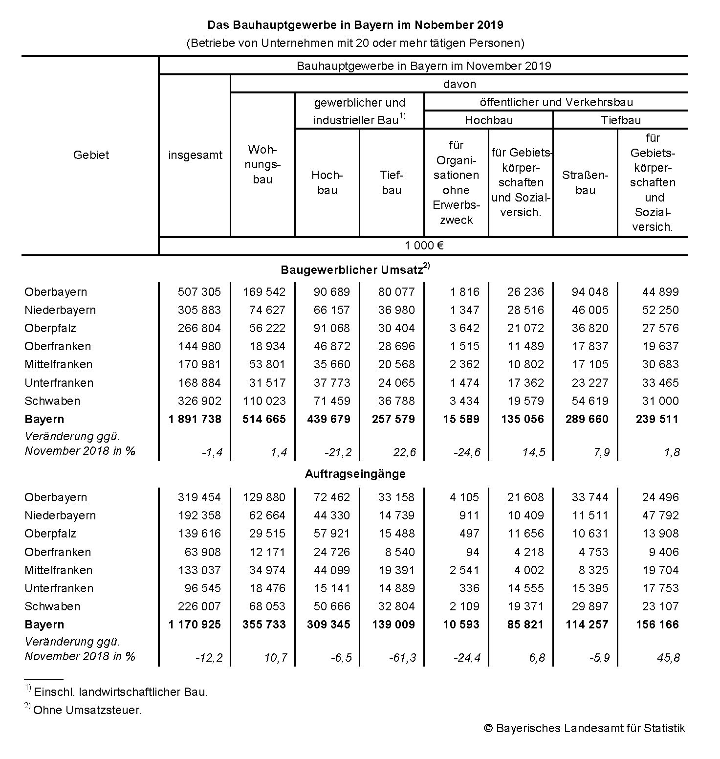 Nach Angaben des Bayerischen Landesamts für Statistik erzielte das Bauhauptgewerbe in Bayern im November 2019 einen baugewerblichen Umsatz in Höhe von 1,89 Milliarden Euro und damit ein um 1,4 Prozent geringeres Ergebnis als vor Jahresfrist (November 2018: 1,92 Milliarden Euro). Zu diesem Umsatzrückgang haben fünf der sieben bayerischen Regierungsbezirke sowie zwei der sieben Bausparten beigetragen, darunter relativ am stärksten bei den Regierungsbezirken die Oberpfalz (-10,0 Prozent gegenüber November 2018) und bei den Bausparten der öffentliche Hochbau für Organisationen ohne Erwerbszweck (-24,6 Prozent). Der Gesamtwert der Auftragseingänge bezifferte sich im Berichtsmonat auf 1,17 Milliarden Euro und lag damit um 12,2 Prozent unter dem vergleichbaren Vorjahresergebnis. Ende November 2019 waren insgesamt 98 981 Personen im bayerischen Bauhautgewerbe tätig (+5,4 Prozent).
