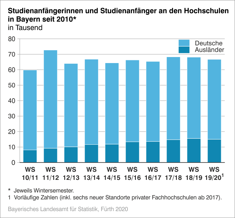 An Universitäten begannen 45 104 junge Menschen im Studienjahr 2019 ihr Studium, was einen Rückgang von 385 zum Vorjahr bedeutet (-0,8 Prozent). Die staatlichen Fachhochschulen hatten eine Abnahme um 1 281 bzw. 5,1 Prozent auf 23 705 Erstimmatrikulierte zu verzeichnen. An nicht-staatlichen Fachhochschulen begannen 5 049 Studierende eine Hochschulausbildung und somit 436 (9,5 Prozent) mehr als im Vorjahr. Ihr Anteil an den insgesamt 28 754 Fachhochschul-Studienanfängern in Bayern beträgt 6,7 Prozent.