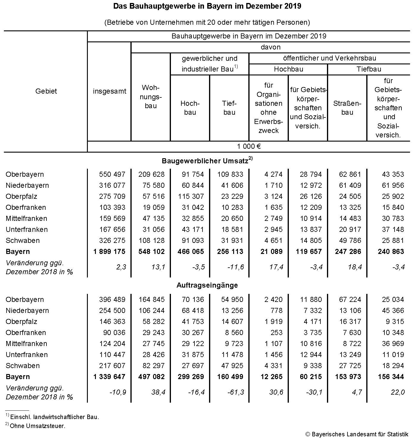Nach Angaben des Bayerischen Landesamts für Statistik erzielte das Bauhauptgewerbe in Bayern im Dezember 2019 einen baugewerblichen Umsatz in Höhe von 1,90 Milliarden Euro und damit ein Umsatzplus von 2,3 Prozent gegenüber Dezember 2018. Während die bauhauptgewerblichen Betriebe in vier der sieben bayerischen Regierungsbezirke ihren baugewerblichen Umsatz im Mittel bis zu 14,1 Prozent gegenüber dem Vorjahresmonat steigern konnten (Mittelfranken, auf 159,6 Millionen Euro), hatten die bauhauptgewerblichen Betriebe in den drei anderen bayerischen Regierungsbezirken durchschnittliche Umsatzeinbußen bis zu 23,4 Prozent hinzunehmen (Oberfranken, auf 103,4 Millionen Euro). Differenziert nach Bausparten zeigt sich ein Umsatzzuwachs bei drei der sieben Bausparten, wobei der Straßenbau mit 18,4 Prozent relativ am stärksten punktete, gefolgt vom öffentlichen Hochbau für Gebietskörperschaften und Sozialversicherungen mit 17,4 Prozent.