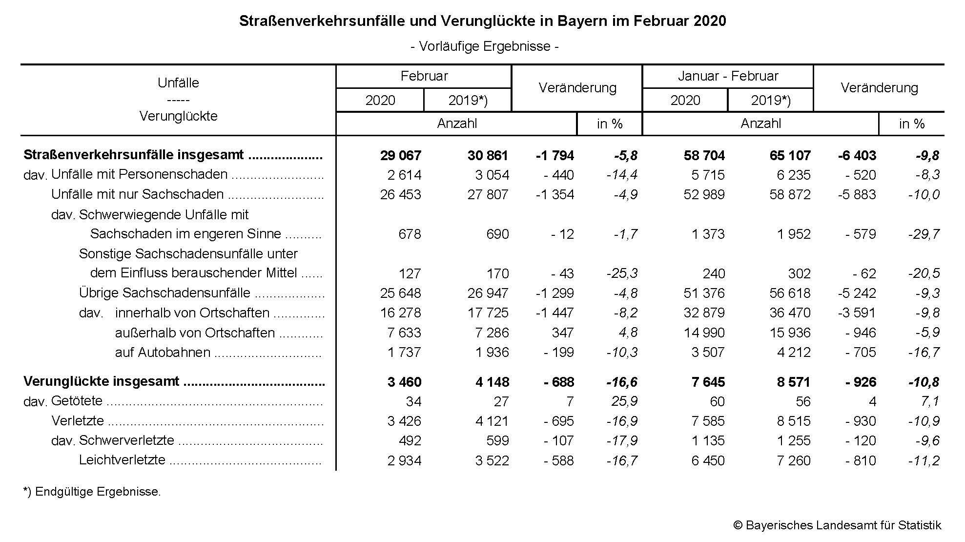 Im Februar 2020 ereigneten sich auf Bayerns Straßen nach den vorläufigen Meldungen der Polizei insgesamt 29 067 Unfälle und somit 5,8 Prozent weniger als im Vorjahresmonat. Nach Mitteilung des Bayerischen Landesamts für Statistik sank die Zahl der Unfälle mit Personenschaden um 14,4 Prozent und der Sachschadensunfälle um 4,9 Prozent. Es wurden 34 Verkehrsteilnehmer getötet (+25,9 Prozent), 492 schwer (-17,9 Prozent) und 2 934 leicht verletzt (-16,7 Prozent).