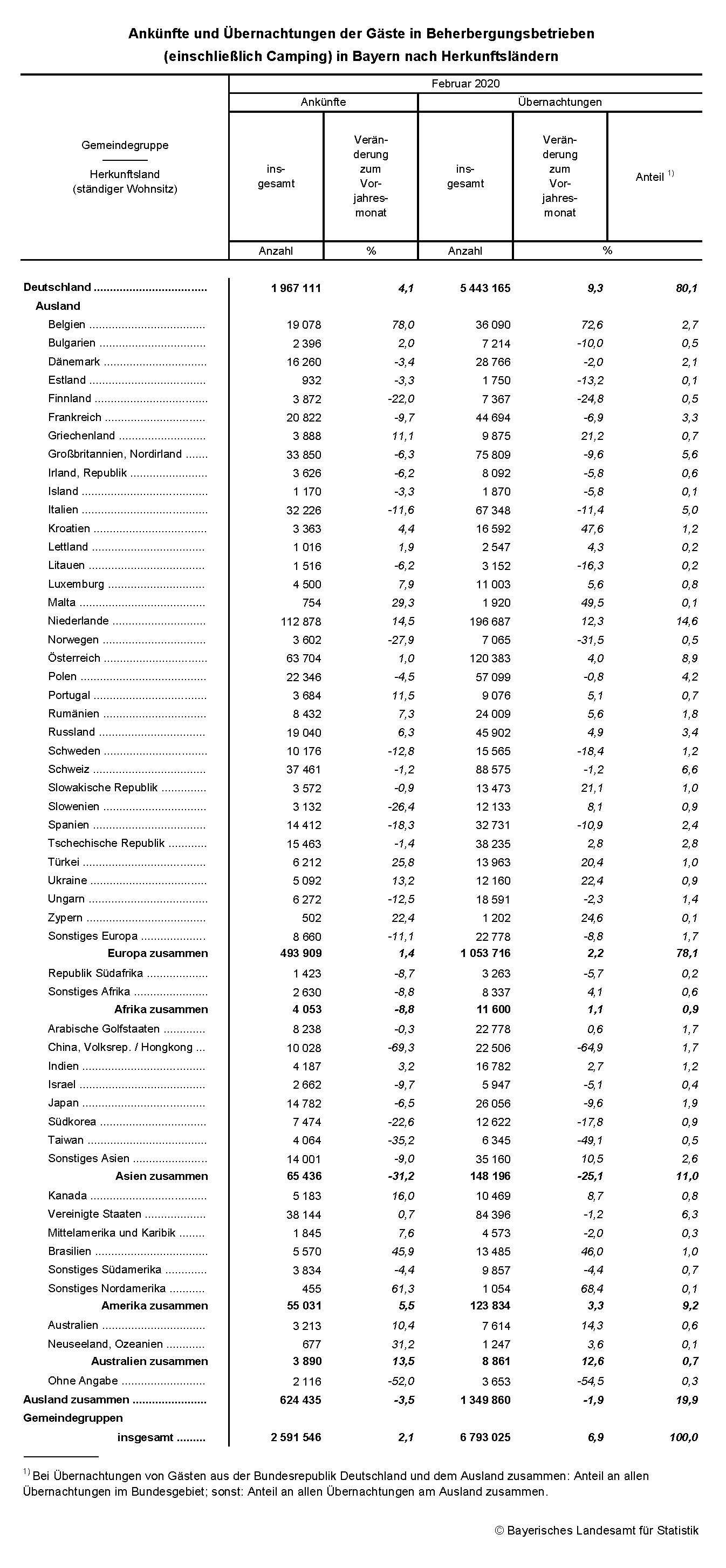 Weniger Gäste und Übernachtungen als im Februar 2019 waren auch für andere Herkunftsländer, u.a. Italien und Spanien, zu verzeichnen. Welchen Anteil hieran die Ausbreitung des Corona-Virus hatte, ist aber nicht eindeutig. Auch andere Einflüsse, wie z.B. die Wetterlage oder die Faschings- und Ferientage könnten eine Rolle gespielt haben. Die Gäste- und Übernachtungszahlen aus den Niederlanden und Belgien zogen im Februar 2020 dagegen deutlich an.