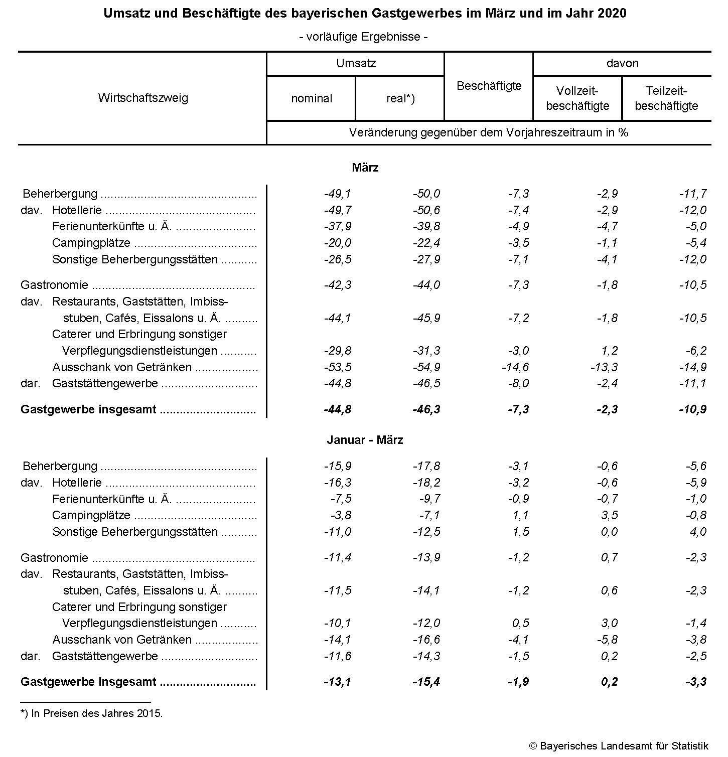 Wie das Bayerische Landesamt für Statistik mitteilt, sind im März 2020 drastische Auswirkungen der Corona-Pandemie auf das Gastgewerbe im Freistaat festzustellen: Der nominale Umsatz des Gastgewerbes verringerte sich gegenüber dem Vorjahresmonat um 44,8 Prozent, der preisbereinigte Umsatz nahm um 46,3 Prozent ab. Die Zahl der Beschäftigten des Gastgewerbes ging im März um 7,3 Prozent zurück, davon sank die Zahl der Vollzeitbeschäftigten um 2,3 Prozent und die Zahl der Teilzeitbeschäftigten um 10,9 Prozent.