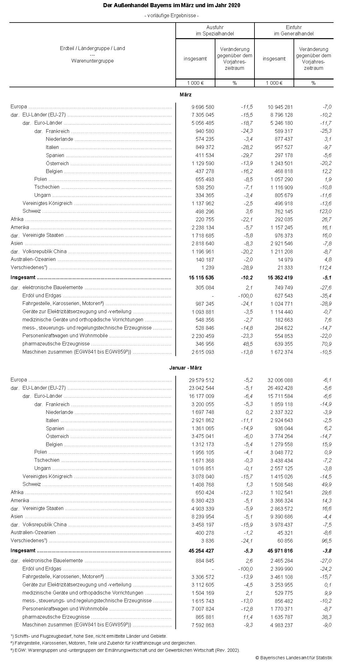 Nach den vorläufigen Ergebnissen des Bayerischen Landesamts für Statistik exportierte die bayerische Wirtschaft im März 2020 Waren im Wert von gut 15,1 Milliarden Euro, dies sind 10,2 Prozent weniger als im Vorjahresmonat. 48,3 Prozent der Exporte wurden in die Mitgliedstaaten der Europäischen Union (EU-27) versandt, darunter wurden 33,5 Prozent aller Exporte in die Euro-Länder geliefert. Die Importe der bayerischen Wirtschaft sanken zeitgleich um 5,1 Prozent auf knapp 15,4 Milliarden Euro. 57,3 Prozent der Importe bezog Bayerns Wirtschaft aus den Ländern der Europäischen Union und 34,2 Prozent aller Importe aus den Ländern der Euro-Zone.
