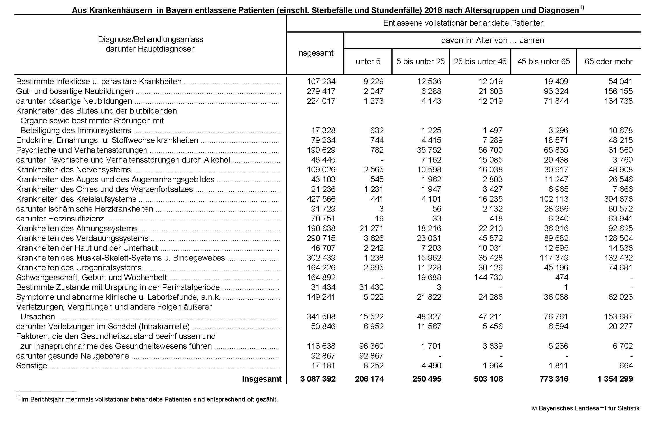 Nach Angaben des Bayerischen Landesamts für Statistik wurden im Jahr 2018 insgesamt 3,09 Millionen Patientinnen und Patienten (Fälle) aus der vollstationären Behandlung in bayerischen Krankenhäusern entlassen. Verglichen mit dem Vorjahr blieb die Anzahl der vollstationären Behandlungsfälle damit nahezu unverändert (- 47 Fälle). Die häufigsten Anlässe für einen vollstationären Krankenhausaufenthalt waren Krankheiten des Kreislaufsystems (13,8 Prozent aller Fälle), gefolgt von Verletzungen, Vergiftungen und anderen Folgen äußerer Ursachen (11,1 Prozent), Krankheiten des Muskel-Skelett-Systems und Bindegewebes (9,8 Prozent), Krankheiten des Verdauungssystems (9,4 Prozent) sowie gut- und bösartige Neubildungen (9,1 Prozent). Die häufigste Hauptdiagnose war, lässt man die klinische Versorgung von Lebendgeborenen (92 867 Fälle) unberücksichtigt, mit 70 751 Fällen die Herzinsuffizienz.
