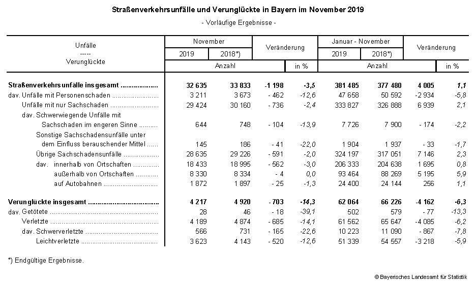 Nach den vorläufigen Meldungen der Polizei ereigneten sich im November 2019 auf Bayerns Straßen insgesamt 32 635 Unfälle. Das waren 3,5 Prozent weniger als im Vorjahresmonat. Wie das Bayerische Landesamt für Statistik weiter mitteilt, sank die Zahl der Unfälle mit Personenschaden um 12,6 Prozent, dabei verunglückten 4 217 Personen (-14,3 Prozent). – Von Januar bis November 2019 ereigneten sich 381 485 Unfälle und damit 1,1 Prozent mehr als im Vorjahreszeitraum. Die Anzahl der Verunglückten sank um 6,3 Prozent.
