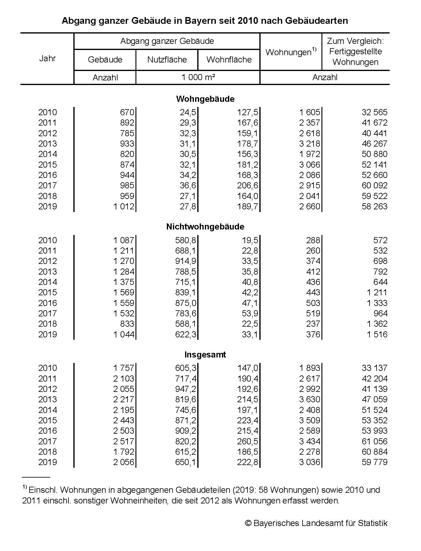 Nach Angaben des Bayerischen Landesamts für Statistik wurde von den bayerischen Bauämtern im Laufe des Jahres 2019 der durch Abriss oder Umwidmung bedingte Abgang von 2 056 Gebäuden und 162 Gebäudeteilen gemeldet (+14,7 Prozent bzw. +28,6 Prozent gegenüber 2018). Von den abgegangenen ganzen Gebäuden in Bayern 2019 waren insgesamt 1 012 bzw. 49,2 Prozent Wohngebäude, darunter 842 bzw. 83,2 Prozent Ein- oder Zweifamilienhäuser (Eigenheime). Mit dem Abgang der insgesamt 2 056 Gebäude gingen in Summe 222 800 m² Wohnfläche sowie 650 100 m² Nutzfläche verloren (+19,5 Prozent bzw. +5,7 Prozent). Mit den insgesamt 2 218 Gebäuden und Gebäudeteilen, die aus dem Gebäudebestand entfielen, wurden zeitgleich 3 036 Wohnungen aus dem Wohnungsbestand beseitigt (+33,3 Prozent), davon 2 660 Wohnungen in Wohngebäuden und 376 Wohnungen in Nichtwohngebäuden (+30,3 Prozent bzw. +58,6 Prozent).